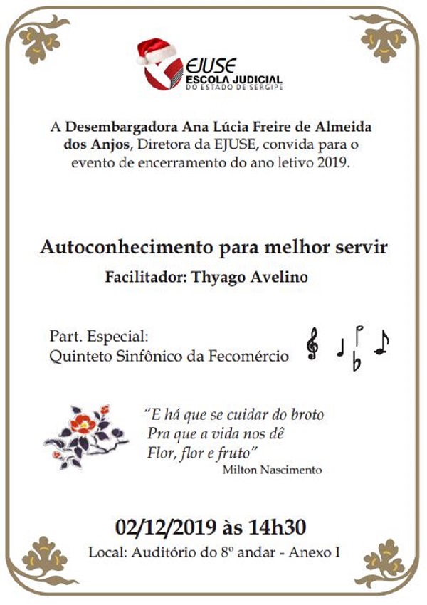"Autoconhecimento para Melhor Servir" será o tema abordado na palestra que encerrará as atividades da Escola Judicial de Sergipe (Ejuse) em 2019. A palestra será ministrado pelo Psicanalista Thyago Avelino, servidor do TJSE e autor de doze livros publicados nacionalmente no âmbito do autoconhecimento integral. O evento está marcado para 2 de dezembro, às 14h30, no 8º andar do Anexo I do TJSE.