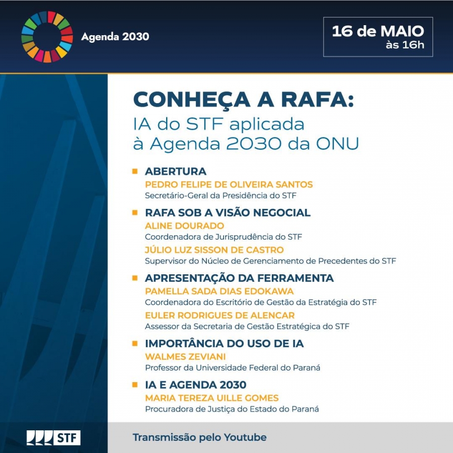 Na próxima segunda-feira (16), às 16h, o Supremo Tribunal Federal (STF) promove o evento virtual “Conheça a RAFA: inteligência artificial do STF aplicada à Agenda 2030 da ONU”. A RAFA 2030 (Redes Artificiais Focadas na Agenda 2030) é uma ferramenta tecnológica desenvolvida para apoiar a classificação de processos na Corte de acordo com os Objetivos de Desenvolvimento Sustentável (ODS) da Agenda 2030 da Organização das Nações Unidas (ONU). O evento será aberto ao público em geral, com transmissão pelo canal do STF no YouTube.