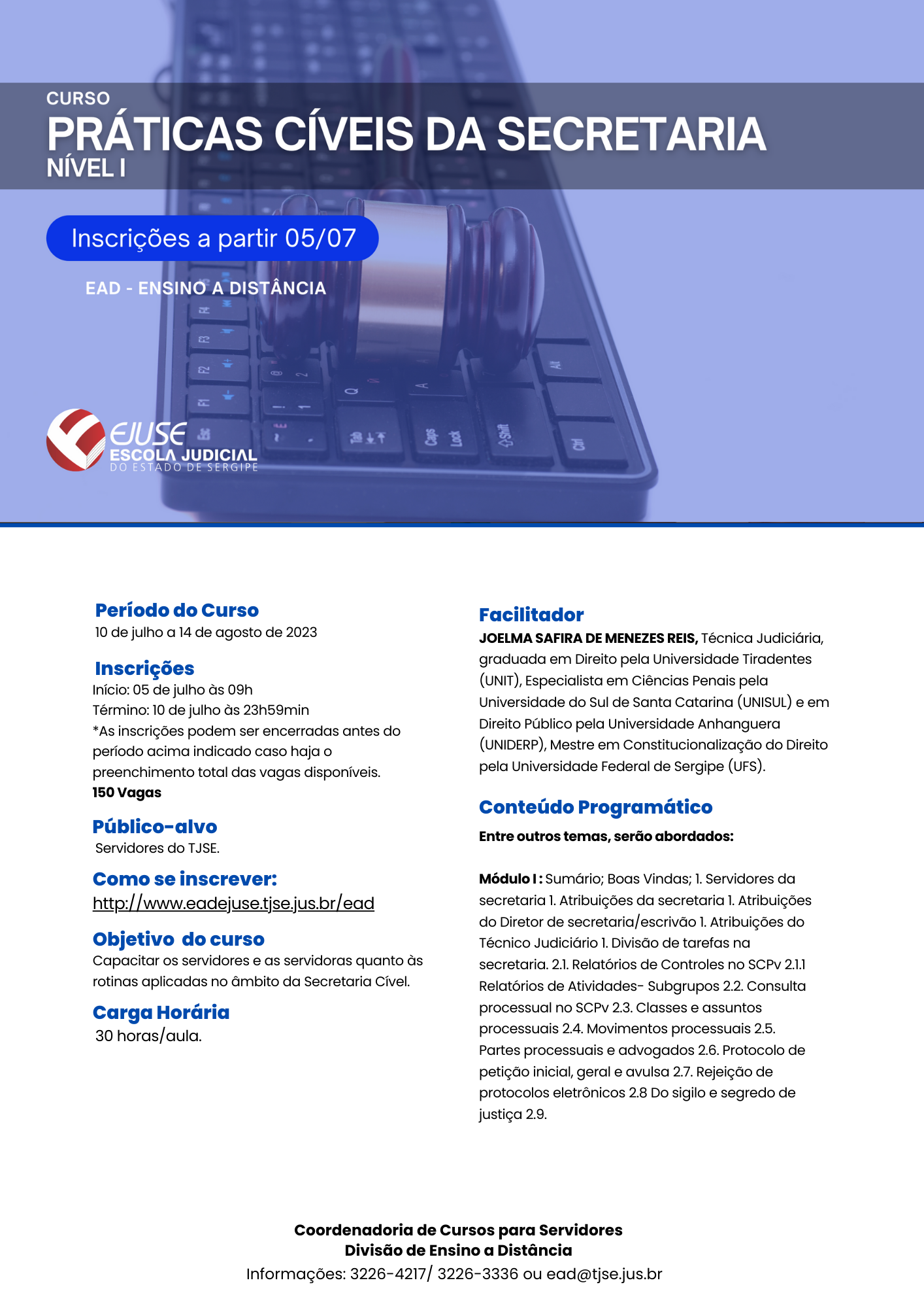 A Ejuse nforma que estão abertas as inscrições para o Curso Práticas Cíveis da Secretaria - Nível 1 (EAD), por meio do endereço www.eadejuse.tjse.jus.br/ead .