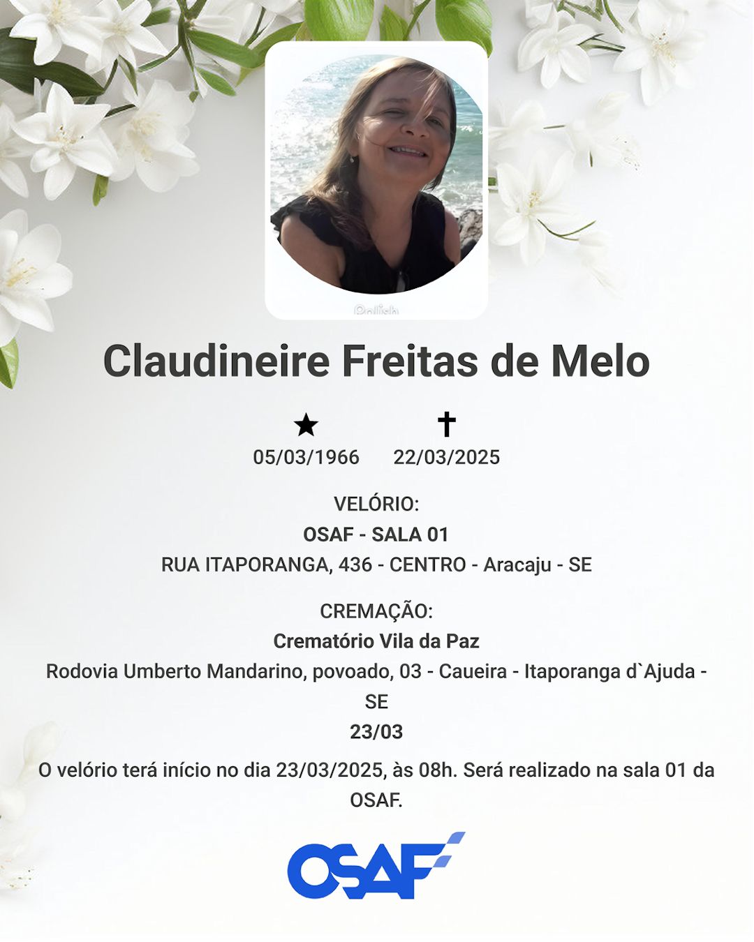 O velório está ocorrendo na Osaf, na rua Itaporanga, centro de Aracaju e a cerimônia de cremação será realizada neste domingo, dia 23/03, no crematório Vila da Paz, na rodovia Umberto Mandarino, Caueira, em Itaporanga d’Ajuda.