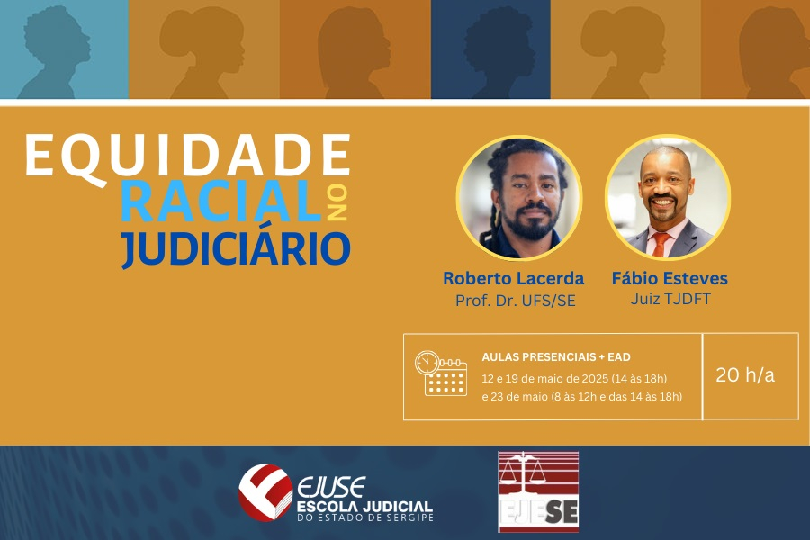 A Escola Judicial de Sergipe (Ejuse) abre inscrições para o curso ‘Equidade Racial no Judiciário’. A capacitação será realizada de 12 a 26 de maio de 2025 e é direcionada para magistrados e servidores do Tribunal de Justiça de Sergipe (TJSE) e do Tribunal Regional Eleitoral em Sergipe (TRE/SE). Os ministrantes serão o professor doutor pela Universidade Federal de Sergipe (UFS), Roberto dos Santos Lacerda, e o magistrado do Tribunal de Justiça do Distrito Federal e dos Territórios (TJDFT), Fábio Francisco Esteves.