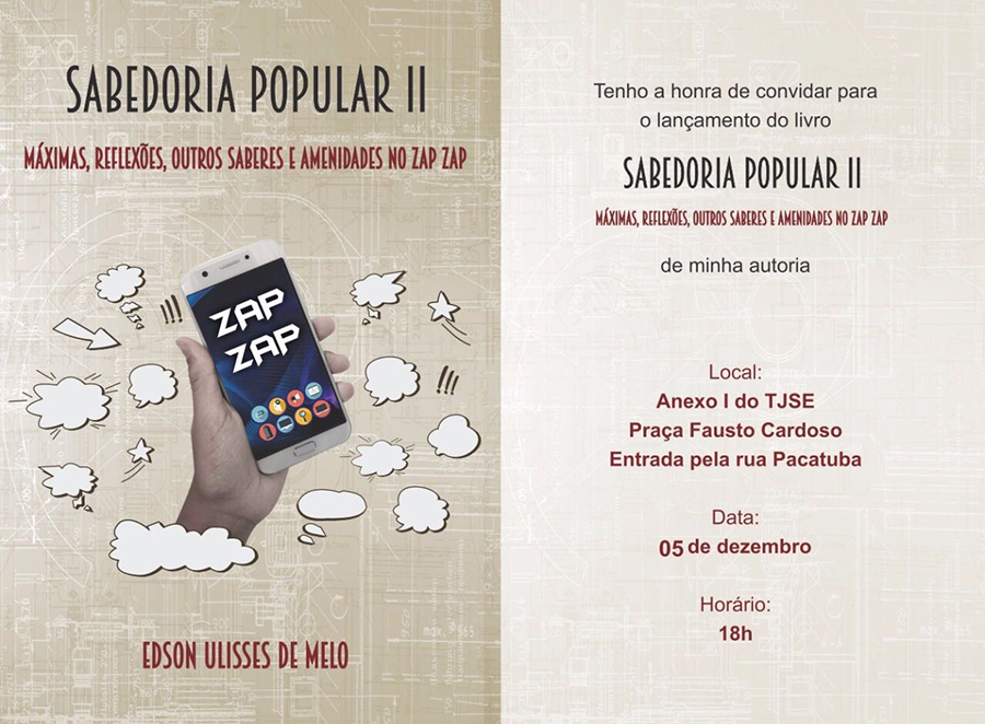 ‘Sabedoria Popular II – Máximas, reflexões, outros saberes e amenidades no zap zap’ é o nome do terceiro livro do Desembargador Edson Ulisses de Melo. O lançamento acontecerá na próxima terça-feira, 05/12, às 18 horas, no hall Anexo I do Palácio da Justiça, à rua Pacatuba, Centro de Aracaju. O livro reúne conteúdos populares que circulam no aplicativo de celular WhatsApp.