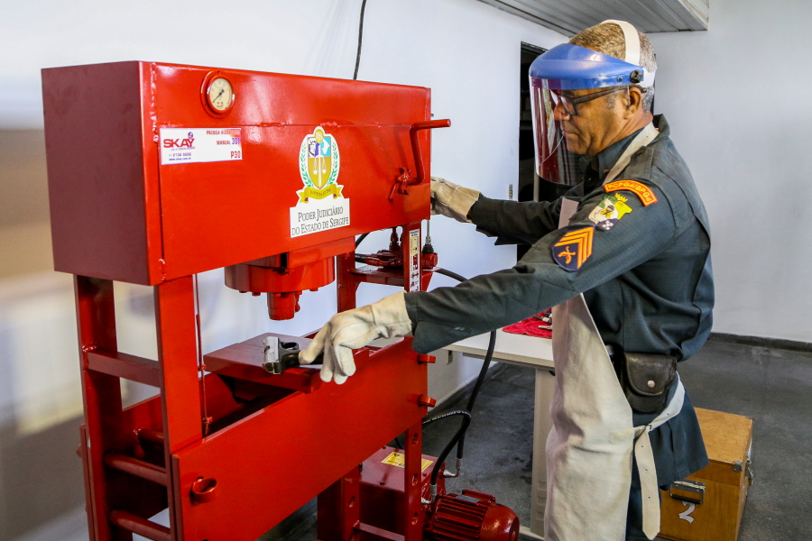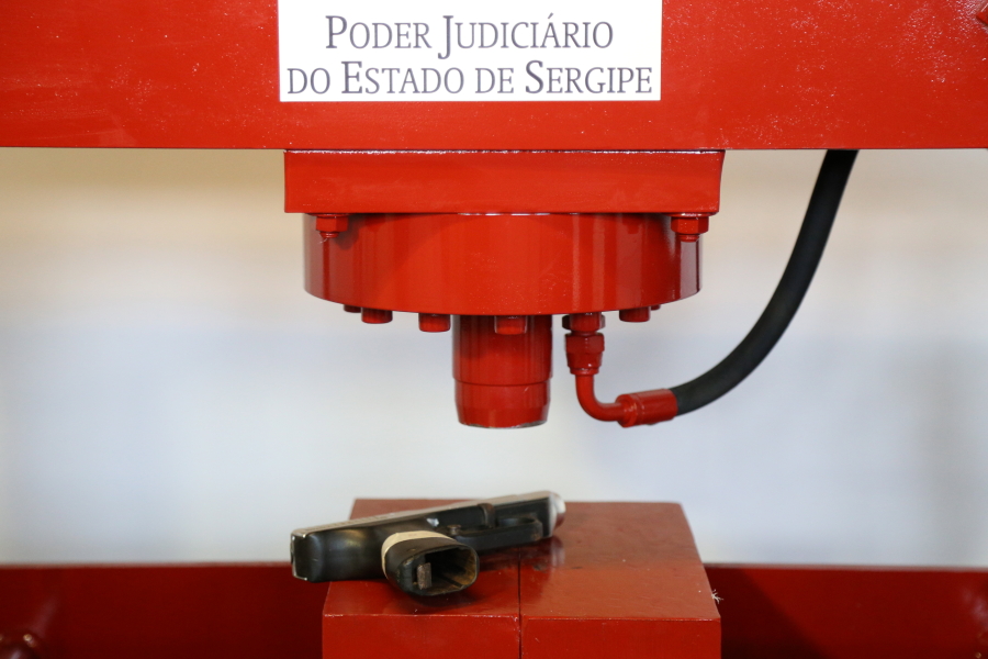 De acordo com o Diretor de Segurança do TJSE, Delegado Flávio Albuquerque, o Poder Judiciário sergipano tornou-se o primeiro Tribunal a ser autorizado à aquisição de uma prensa hidráulica motorizada, com capacidade de força de trinta toneladas, que previamente inutiliza todos os armamentos.