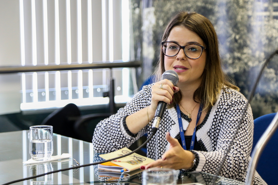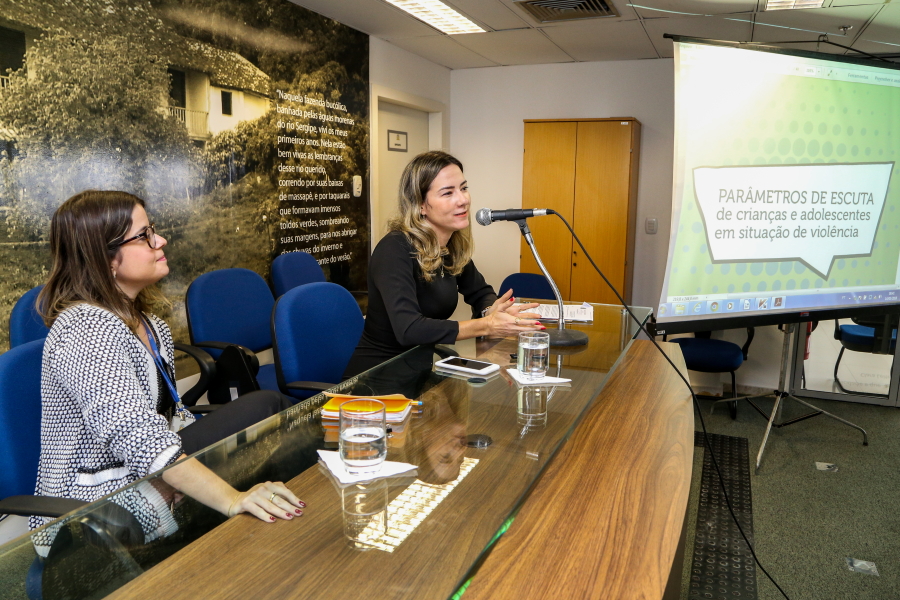 A primeira discussão da manhã teve o tema Depoimento Especial: construindo o fluxo a partir de uma perspectiva de atendimento emergencial e descentralizado, comandada pela Juíza de Direito, Juliana Nogueira e pela Analista Judiciária, Ester Maynard, que é psicóloga da Equipe Multidisciplinar de Depoimento Especial do TJSE.