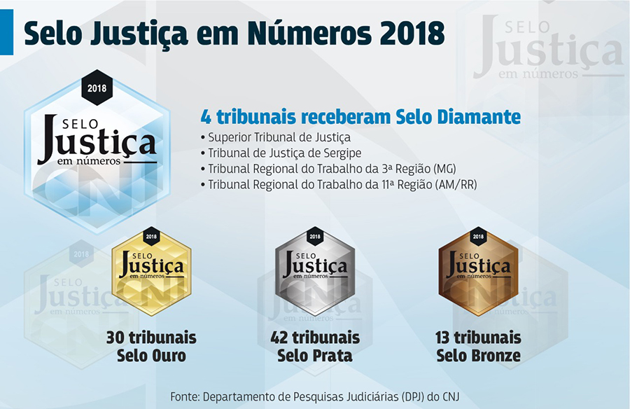 O Conselho Nacional de Justiça (CNJ) entregou o Selo Justiça em Números aos tribunais brasileiros, durante o XII Encontro Nacional do Poder Judiciário, que está ocorrendo na cidade de Foz do Iguaçu/PR. Quatro tribunais ganharam o Selo Diamante, categoria máxima do prêmio – as demais categorias são ouro, prata e bronze. O Selo é concedido pelo CNJ desde 2014 aos tribunais que mais investem na excelência da produção, gestão, organização e disseminação de suas informações administrativas e processuais.