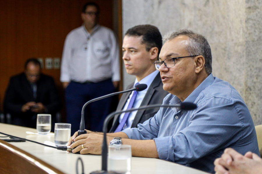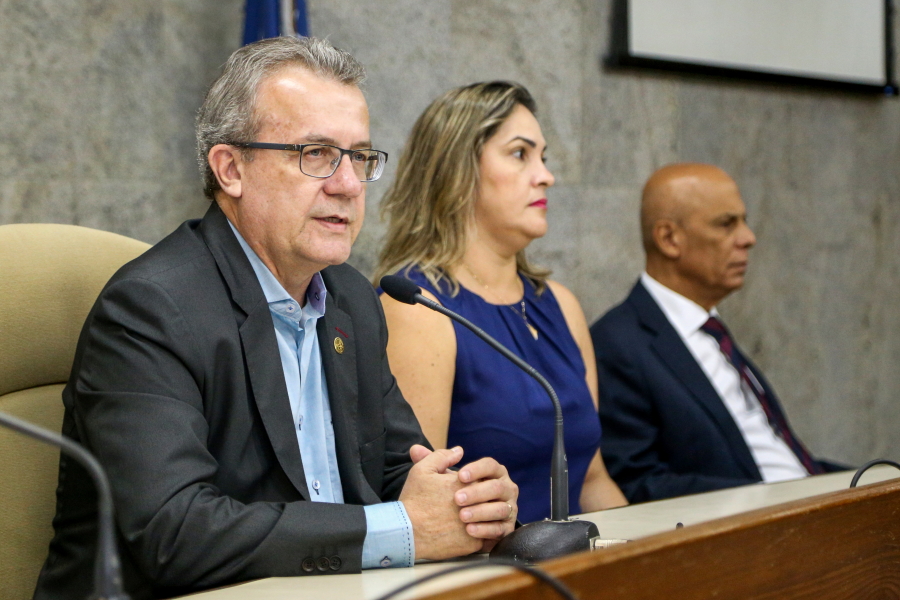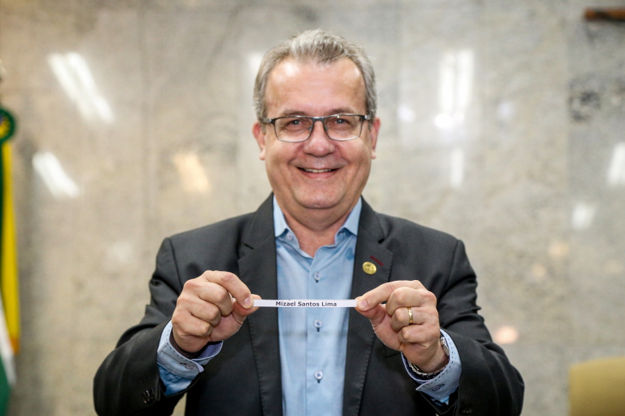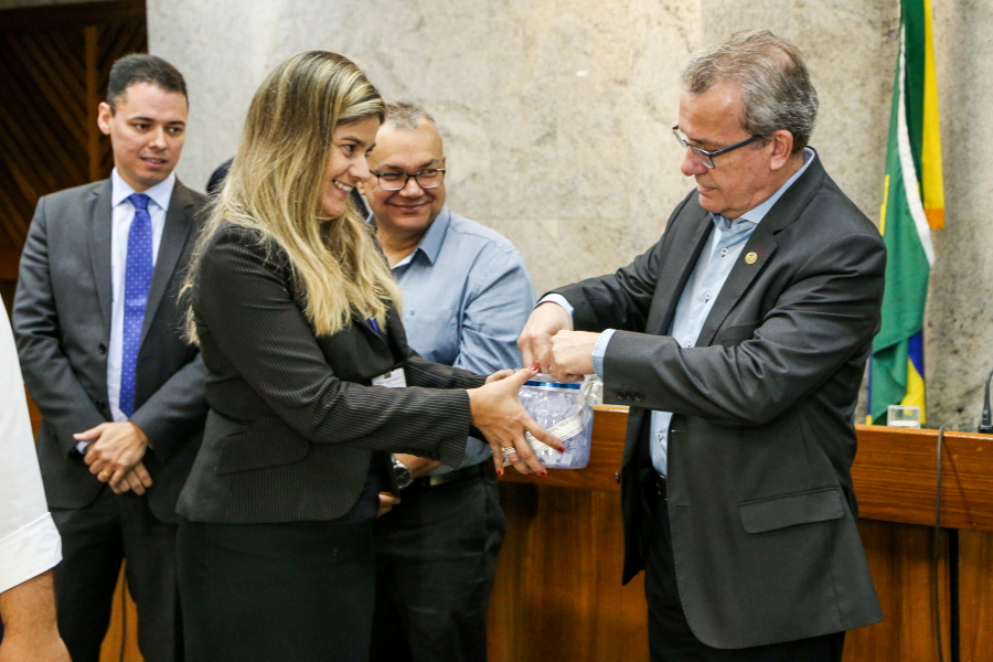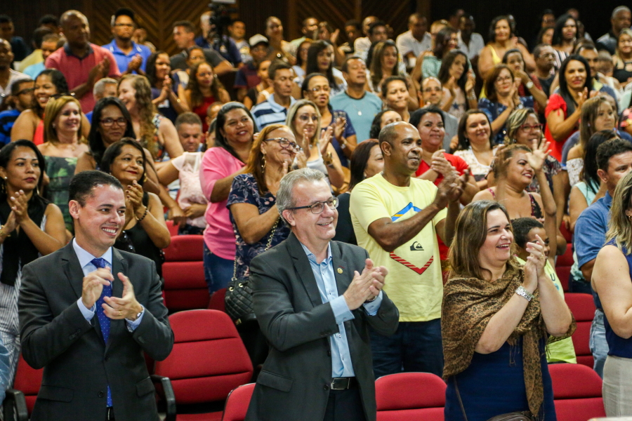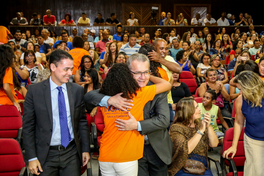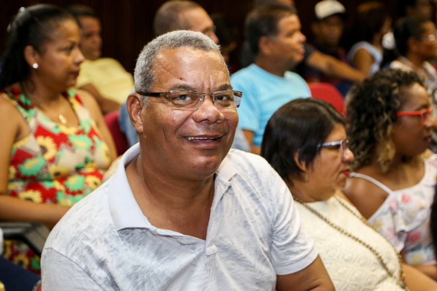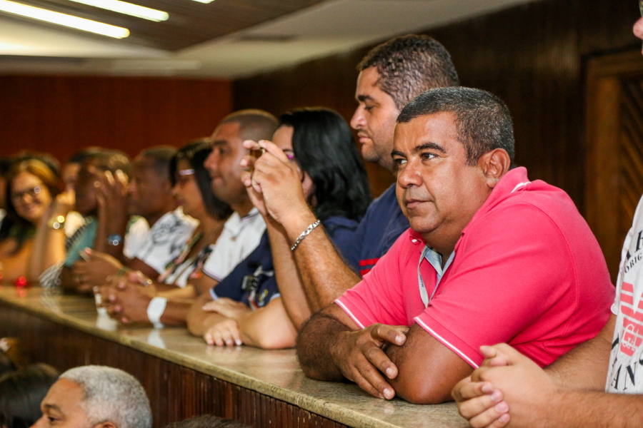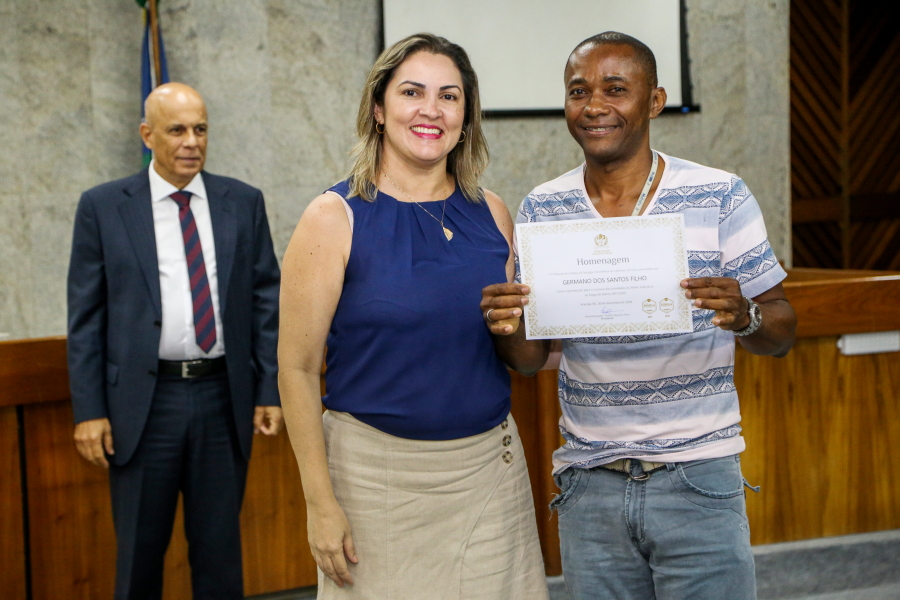 No palco, o Presidente do TJSE, Desembargador Cezário Siqueira Neto, a Secretária de Planejamento e Administração do TJSE, Márcia Martins, o Gerente Operacional da Multiserv, Levi Oliveira, e os Juízes auxiliares da Presidência, Leonardo Almeida e Gilson Felix, se revezaram na entrega dos certificados que foi realizada por representante de categoria. O bombeiro hidráulico, Jardilino Araújo, foi um dos contemplados. “É uma homenagem que me deixa muito feliz. Hoje é um dia feliz”, comemorou.