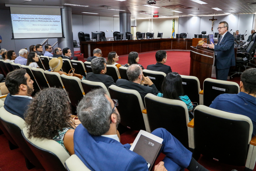 O Presidente do Tribunal de Justiça de Sergipe (TJSE), Des. Cezário Siqueira Neto, acompanhado pela Juíza gestora do Departamento de Precatórios (Deprec), Maria da Conceição da Silva Santos, apresentou durante audiência pública realizada na quarta-feira, 23/01, o Relatório de Atividades do Deprec. O objetivo do encontro com a sociedade sergipana foi dar publicidade ao trabalho desenvolvido na área de precatórios no biênio 2017/2019.