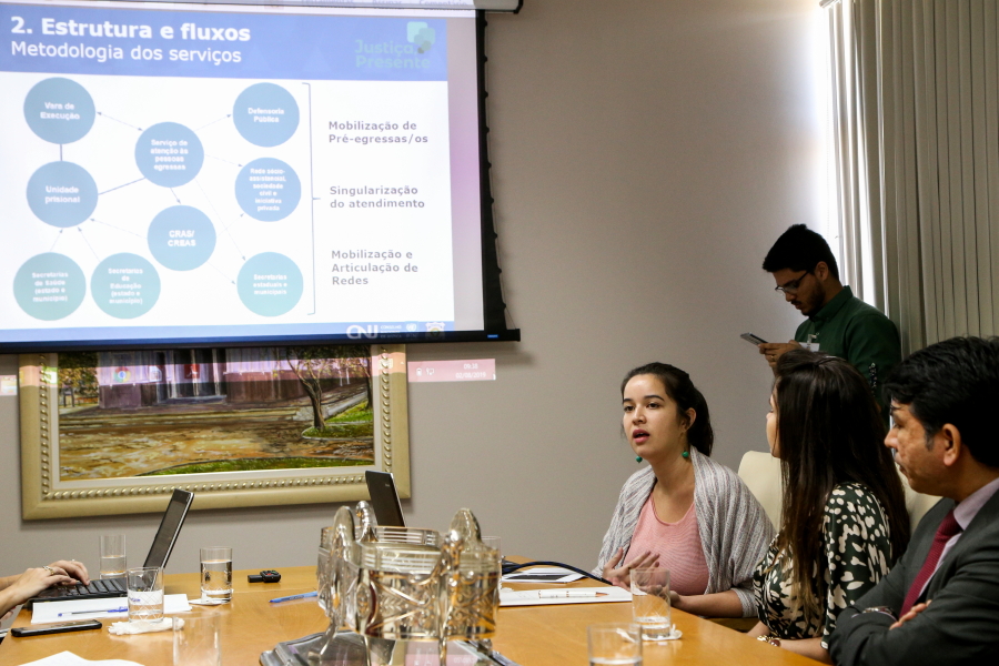 O Escritório Social foi apresentado pela Coordenadora Estadual do Programa Justiça Presente (CNJ/ PNUD), Isabela Cunha, nesta sexta-feira, dia 02, à Vice-governadora, Eliane Aquino, e aos representantes das Secretarias de Estado envolvidas no cumprimento da execução penal e das políticas públicas de assistência aos apenados e egressos do sistema carcerário. A Coordenadora expôs um plano de ação, considerando o mapeamento das estruturas que já existem em Sergipe de atenção e assistência aos egressos, tanto na Vara de Execuções Criminais (VEC), quanto por meio de programas desenvolvidos pelo Executivo.