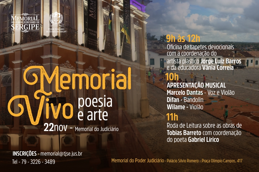 ‘Memorial: poesia e arte’ é o nome do evento que acontecerá no dia 22 de novembro, sexta-feira, das 9 às 12 horas, no Memorial do Judiciário. Na ocasião, haverá uma oficina de tapetes devocionais – como os confeccionados durante o Corpus Christi, mas com temas natalinos – sob a coordenação do artista plástico Jorge Luiz Barros e da educadora Vânia Correia.