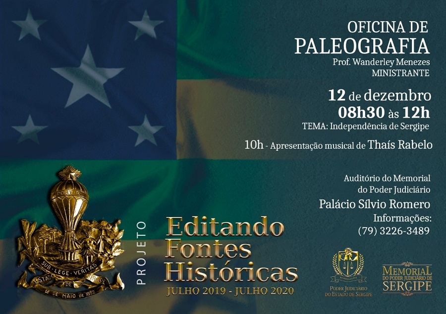 Estão abertas as inscrições para Oficina de Paleografia que será realizada no Memorial do Judiciário, na próxima quinta-feira, 12/12, das 8h30 às 12h. A oficina, que será ministrada pelo professor Wanderley Menezes, faz parte do Projeto Editando Fontes Histórias. Na ocasião, também haverá apresentação da harpista Thaís Rabelo.