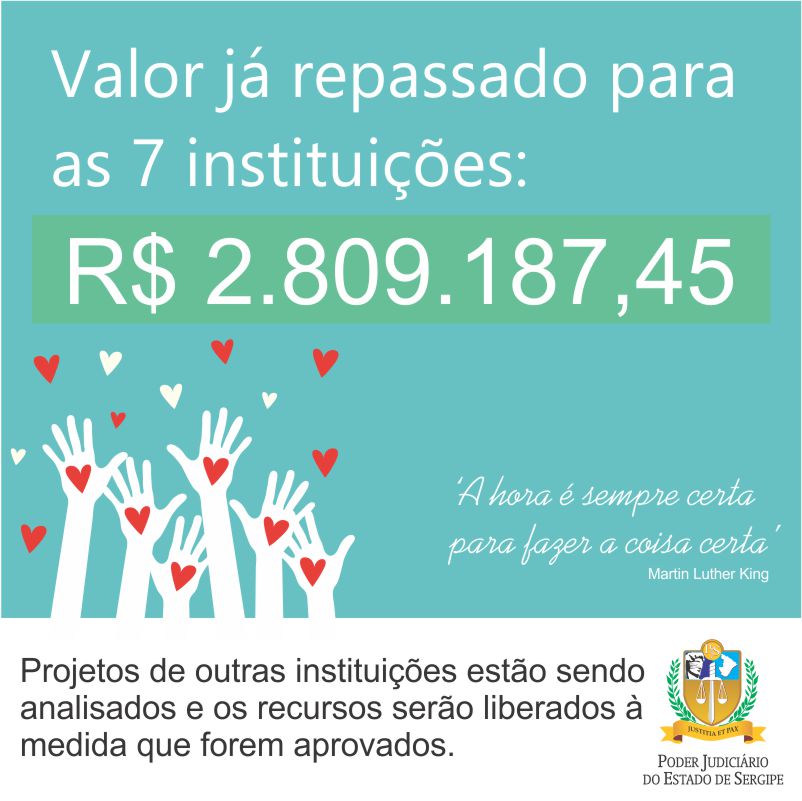 Desde o dia 31 de março, o TJSE já destinou R$ 2.809.187,45 para o combate ao coronavírus. Ao todo, o TJSE prevê a liberação de cerca de R$ 4 milhões provenientes de penas pecuniárias. Todas instituições inscreveram, junto ao TJSE, projetos para receber as verbas, com base no Edital 01/2020 da Corregedoria Geral da Justiça, que dispôs sobre o credenciamento prévio de entidades públicas ou privadas com finalidade adoção de medidas preventivas ao Covid-19.