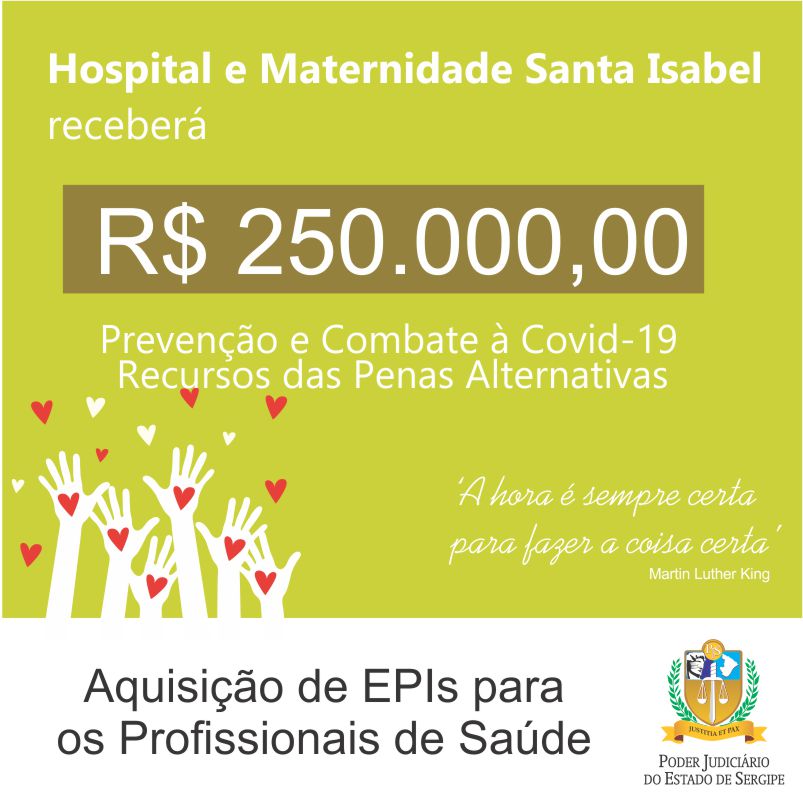 Nesta quinta-feira, 02/04, foram liberados pelo Tribunal de Justiça de Sergipe (TJSE), através da Corregedoria Geral de Justiça, mais R$ 811.970,00, valor relativo a penas pecuniárias, para o combate ao coronavírus. Dessa vez, foram beneficiados o Hospital Universitário, R$ 459.050,00; o Hospital e Maternidade Santa Isabel, R$ 250.000,00; e o Hospital São José, R$ 102.920,00. Os três hospitais, localizados em Aracaju, deverão comprar Equipamentos de Proteção Individual (EPIs) para suas respectivas equipes de saúde.