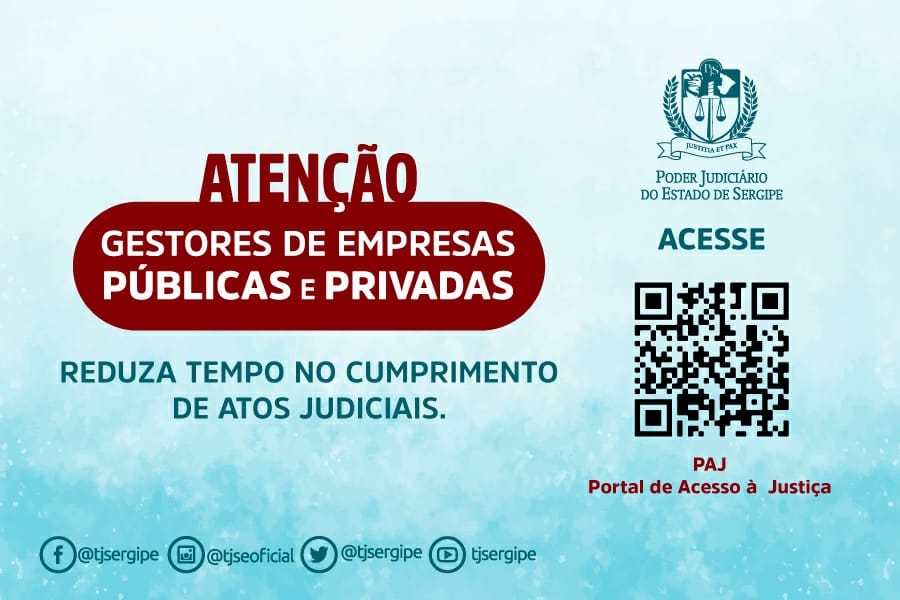 O Tribunal de Justiça do Estado de Sergipe (TJSE) vem reforçar junto às pessoas jurídicas, empresas públicas e privadas, entidades da administração indireta do Estado e dos Municípios e Procuradorias (estaduais e municipais) a premente necessidade do credenciamento junto ao Portal de Acesso à Justiça (PAJ), especificamente aos que ainda não tenham promovido o seu cadastro, a fim de viabilizar que as intimações eletrônicas sejam realizadas.