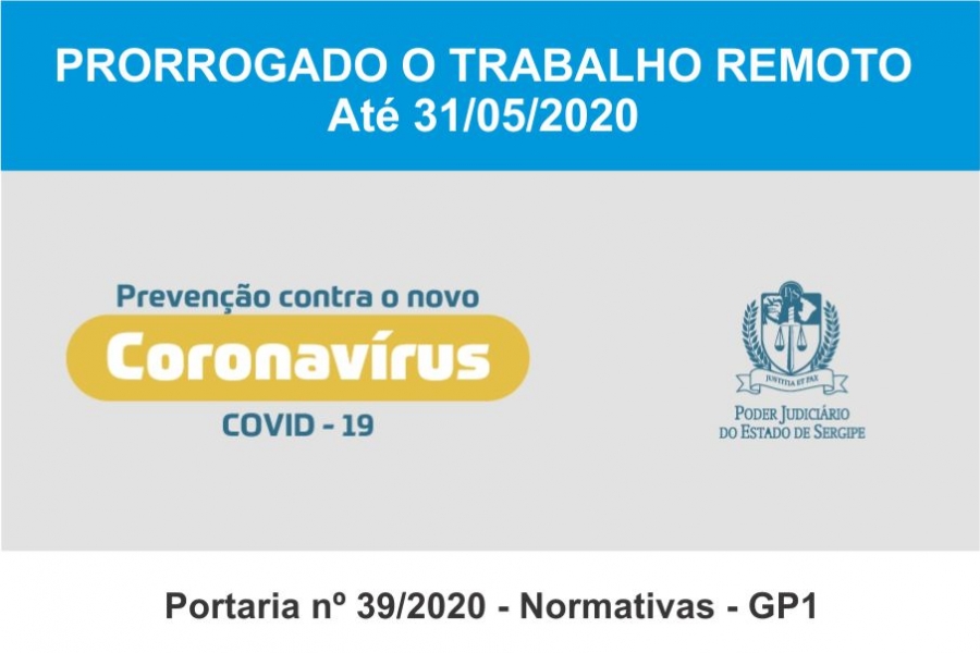 Foi divulgada do Diário da Justiça desta segunda-feira, 11/5, a Portaria nº 39/2020 – GP1 Normativa, prorrogando até 31 de maio o prazo de vigência do regime diferenciado de trabalho remoto integral para os servidores das unidades jurisdicionais e administrativas do Tribunal de Justiça de Sergipe (TJSE), da capital e interior.