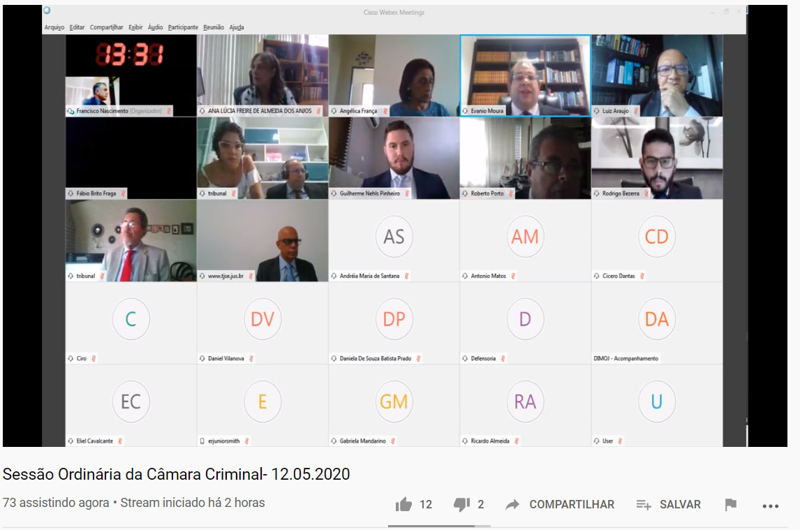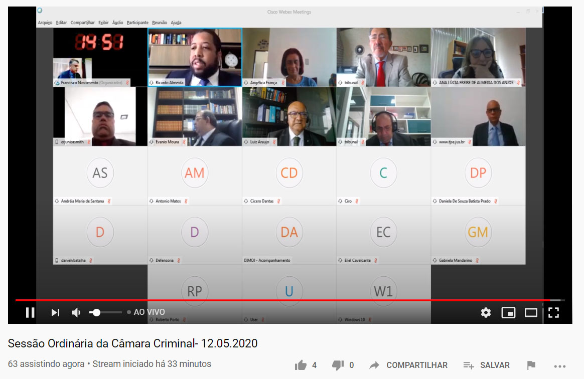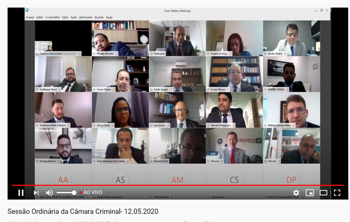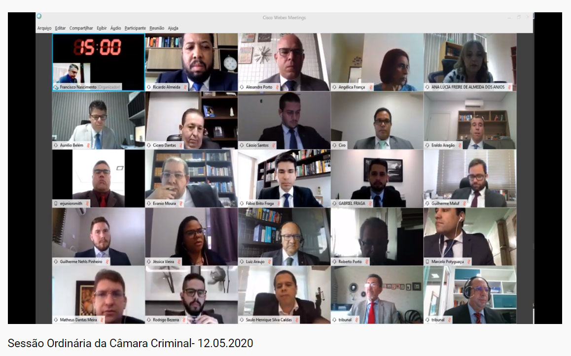 Com a participação de juízes convocados, advogados, representantes do Ministério Público e Defensoria Pública, a Câmara Criminal realizou nesta terça-feira, 12/5, sua primeira sessão por videoconferência, modalidade inédita no âmbito do segundo grau do Tribunal de Justiça de Sergipe (TJSE). A sessão, que foi transmitida ao vivo pelo canal do TJSE no YouTube, teve 173 processos colocados em pauta, sendo que 153 foram julgados, com 28 sustentações orais, e 20 foram retirados de pauta.