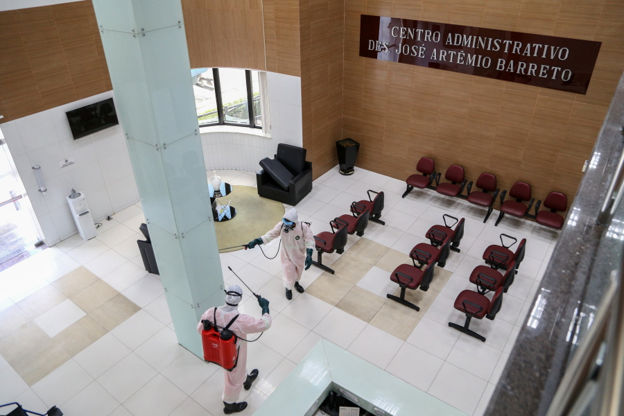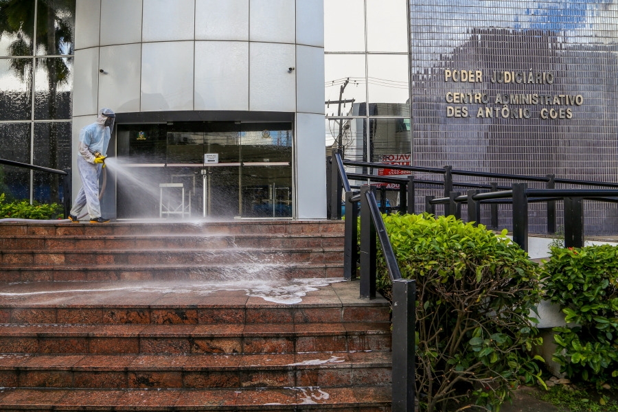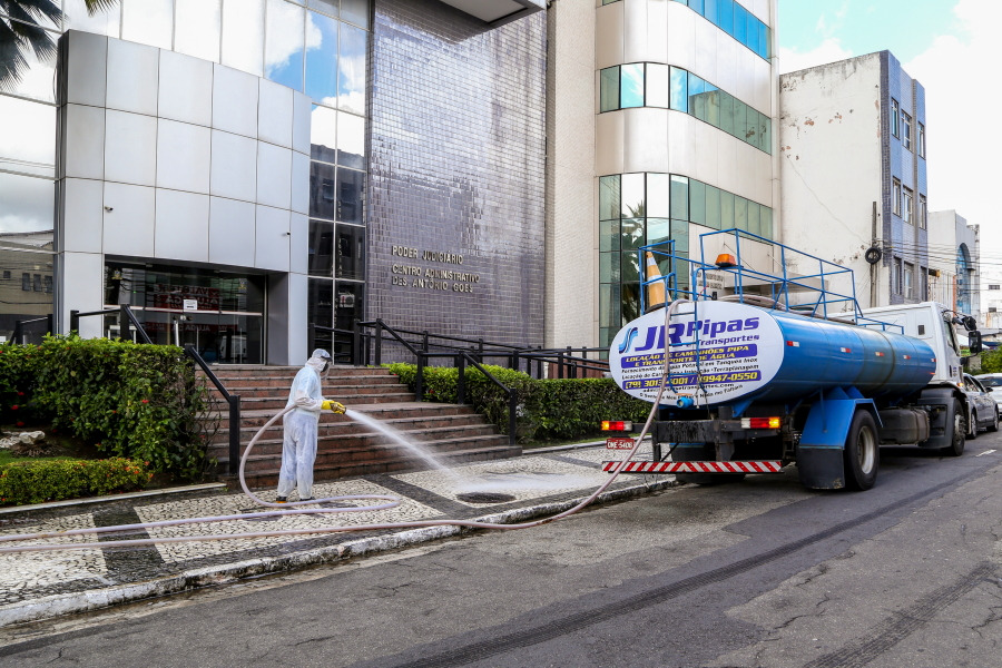 “Infelizmente, um servidor do Fórum Gomersindo Bessa foi diagnosticado com a Covid-19 e, por este motivo, iniciamos a desinfeção por lá. Depois, seguimos com a desinfecção no Palácio da Justiça e nos dois Anexos Administrativos, onde há servidores trabalhando presencialmente. A equipe que desenvolve esse trabalho é exclusiva da Prefeitura, com uma estrutura grande, que conta com vários caminhões-pipa, produtos químicos e pessoas capacitadas para a aplicação”, informou o Diretor.