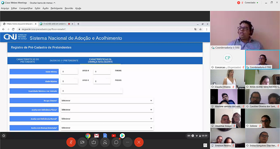 Pela primeira vez, a Coordenadoria da Infância e Juventude (CIJ) do Tribunal de Justiça de Sergipe (TJSE) ofereceu o Curso Preparatório para Adotantes por meio de videoconferência. O curso foi ofertado durante toda a manhã da última sexta-feira, 07/08, por meio da plataforma Cisco Webex, e contou com a participação de casais e pessoas que já estavam cadastradas no Sistema Nacional de Adoção (SNA). Os participantes, que estão em diversos estágios do processo de adoção, puderam esclarecer inúmeras dúvidas.