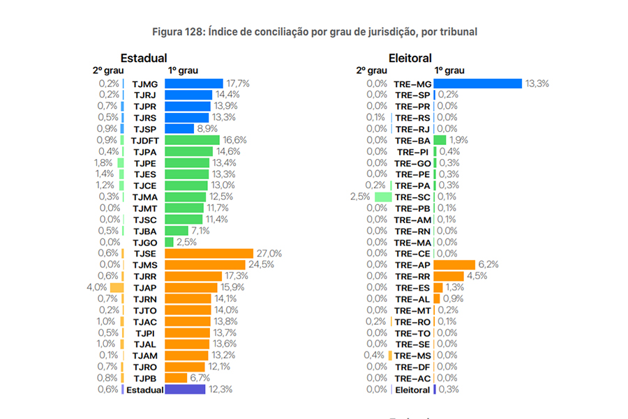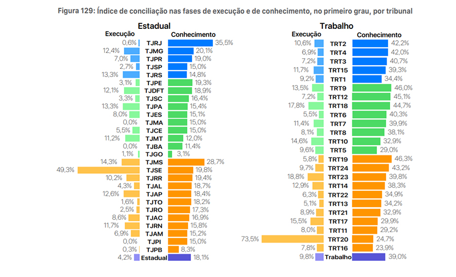 O Relatório Justiça em Números divulgado ontem, 25/8, pelo Conselho Nacional de Justiça (CNJ) revelou que o Tribunal de Justiça de Sergipe (TJSE) tem os melhores índices de conciliação do Brasil. O índice de conciliação em Sergipe, em 2019, foi de 24,8%, entre os Tribunais Estaduais de grande, médio e pequeno porte, ficando bem acima da média nacional, que foi 11,3%. O TJSE também figurou em primeiro lugar no índice de conciliação por grau de jurisdição, com 27% no 1º Grau; sendo a média nacional 12,3%. Quanto ao índice de conciliação na fase de execução do processo, o TJSE registrou o maior do país, 49,3%, enquanto a média nacional foi de 4,2%.