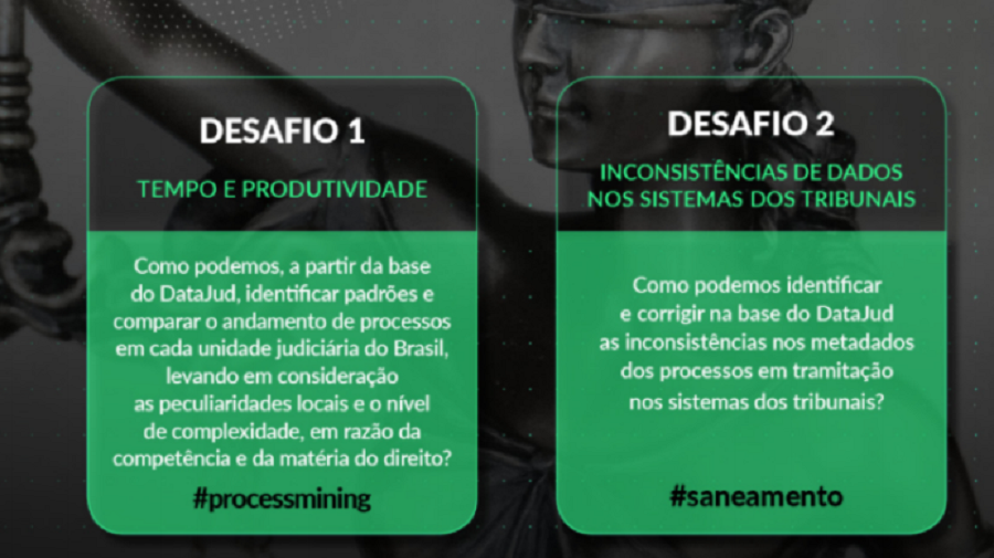 O Conselho Nacional de Jusça – CNJ e a Enap prepararam dois desafios na área de dados e inteligência artificial. O primeiro desafio é para que as equipes desenvolvam, a partir da base do DataJud, soluções que possibilitem a identificação de padrões e a comparação do andamento de processos em cada unidade judiciária do Brasil. O desenvolvimento deve levar em conta as peculiaridades locais e o nível de complexidade que envolve o Direito.