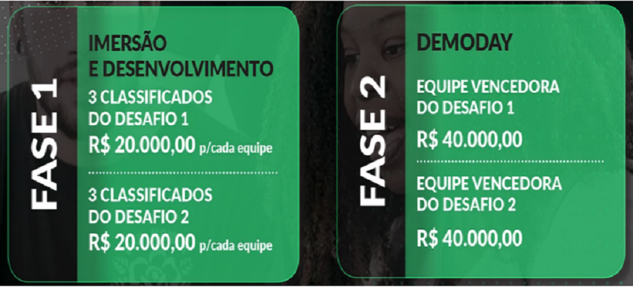 A premiação será na Semana de Inovação 2020, agendada para o período de 16 a 19 de novembro. A maratona conta com duas fases: imersão com desenvolvimento e Demoday. Seis equipes serão classificadas para o Demoday e ganham o prêmio de R$ 20 mil. Neste dia, haverá melhoria de design dos projetos e preparação para fase de pitching, que é o momento de apresentação e defesa das iniciativas. Duas equipes serão escolhidas vencedoras e receberão novo prêmio de R$ 40 mil cada.