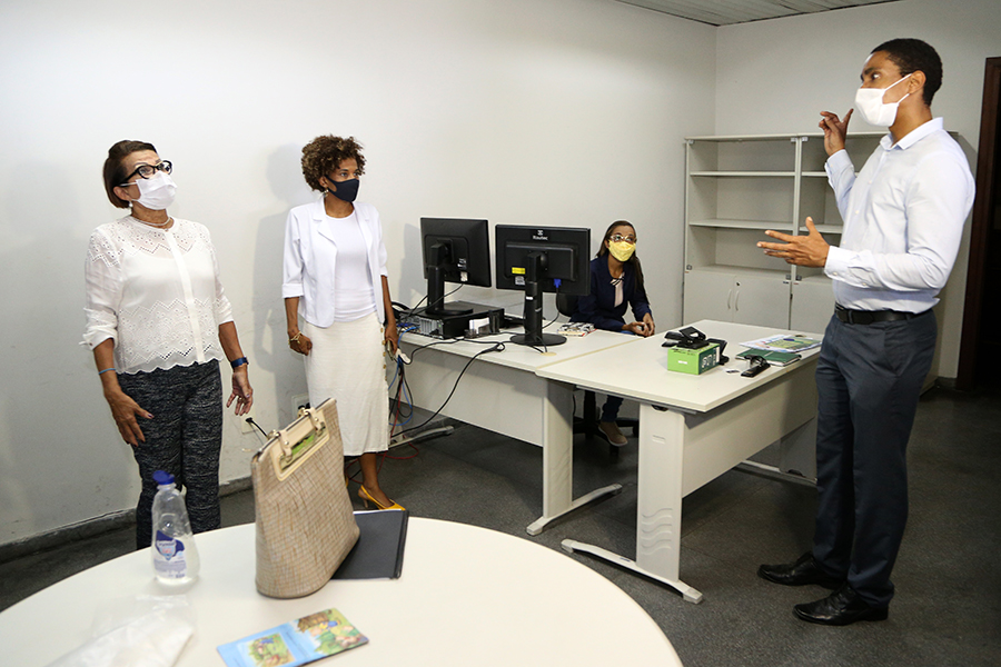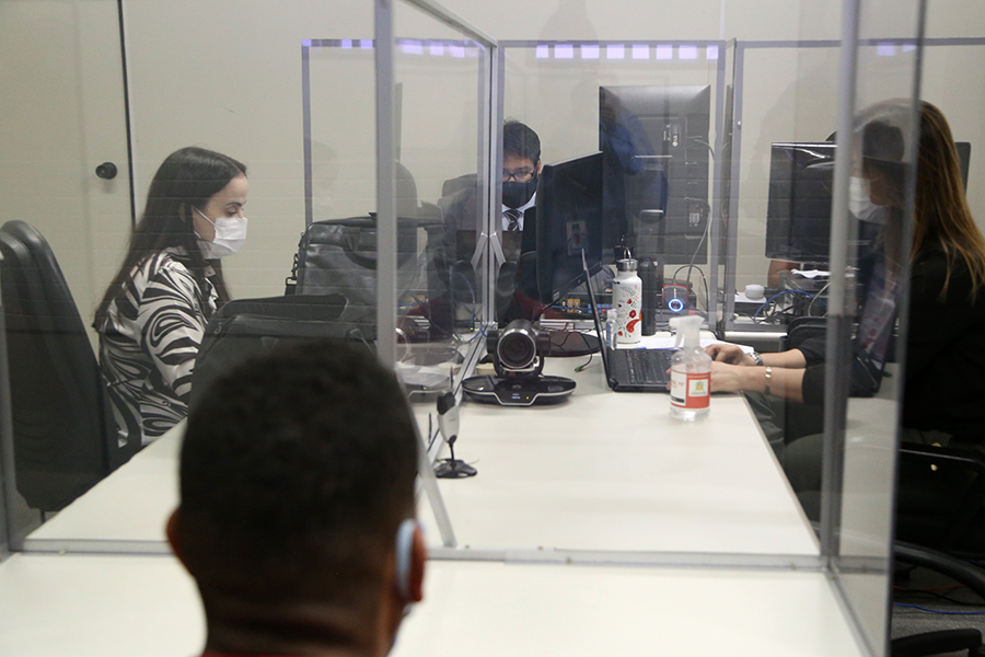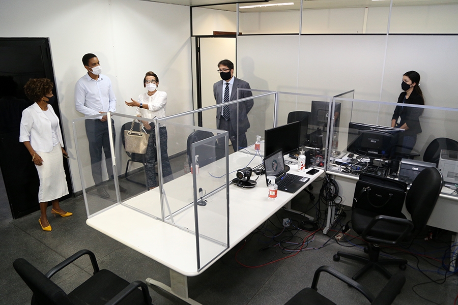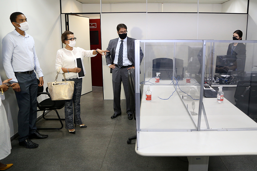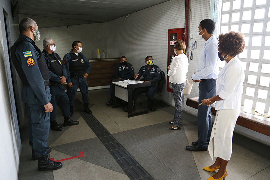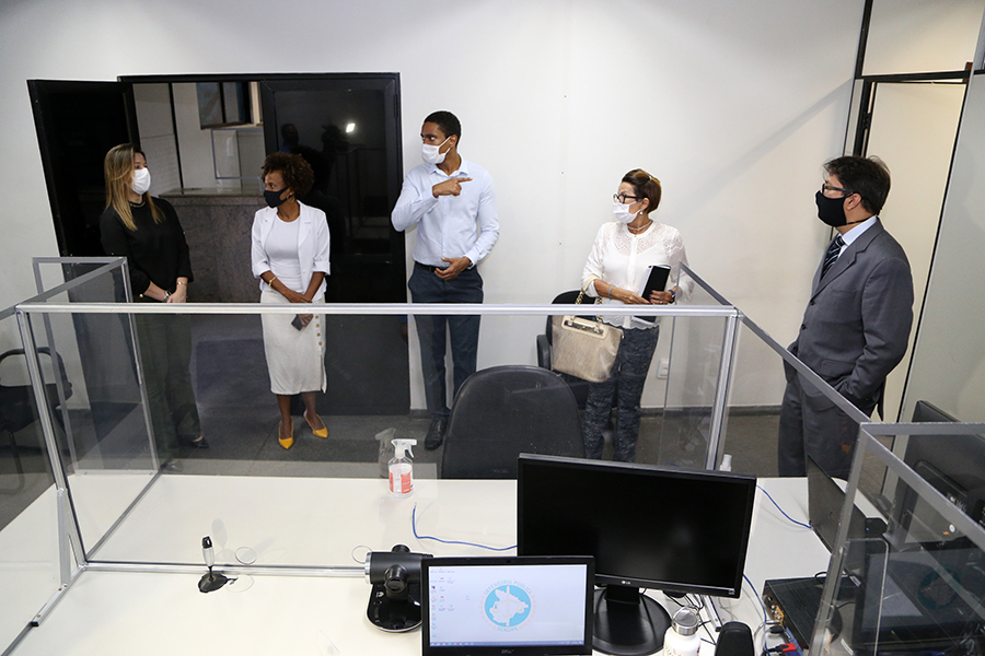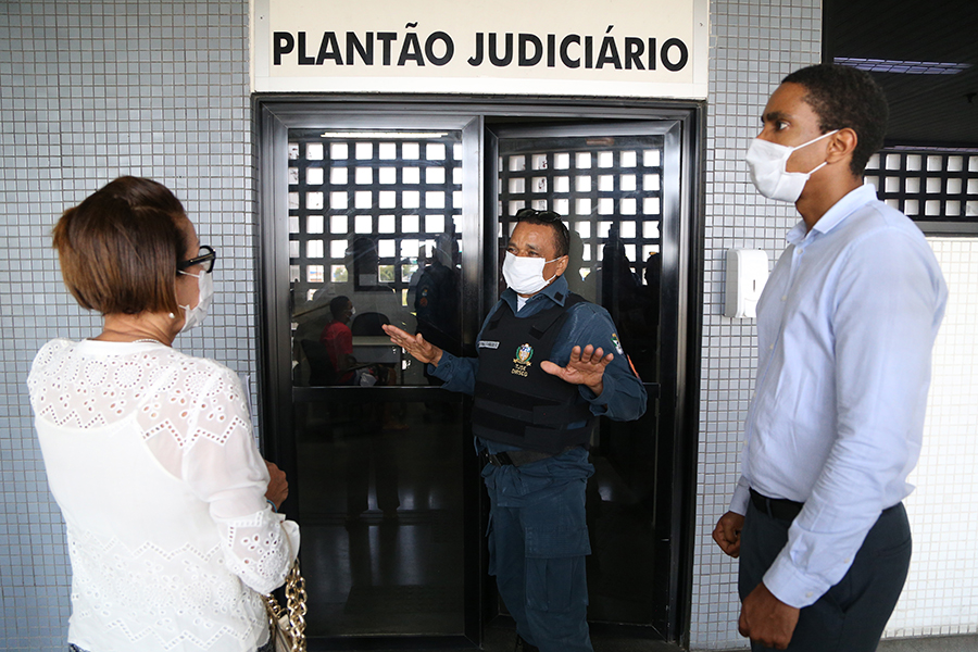Inicialmente, eles estiveram na sala onde as audiências de custódia são realizadas; onde questionaram sobre o distanciamento entre os envolvidos, uso de equipamentos de proteção individual, como a máscara, higienização da sala e se há compartilhamento de documentos. O Juiz de Direito Daniel Vasconcelos, que preside as audiências, explicou que o termo, antes assinado pelas partes envolvidas, agora é assinado somente por ele, justamente para evitar que várias pessoas toquem o mesmo papel.