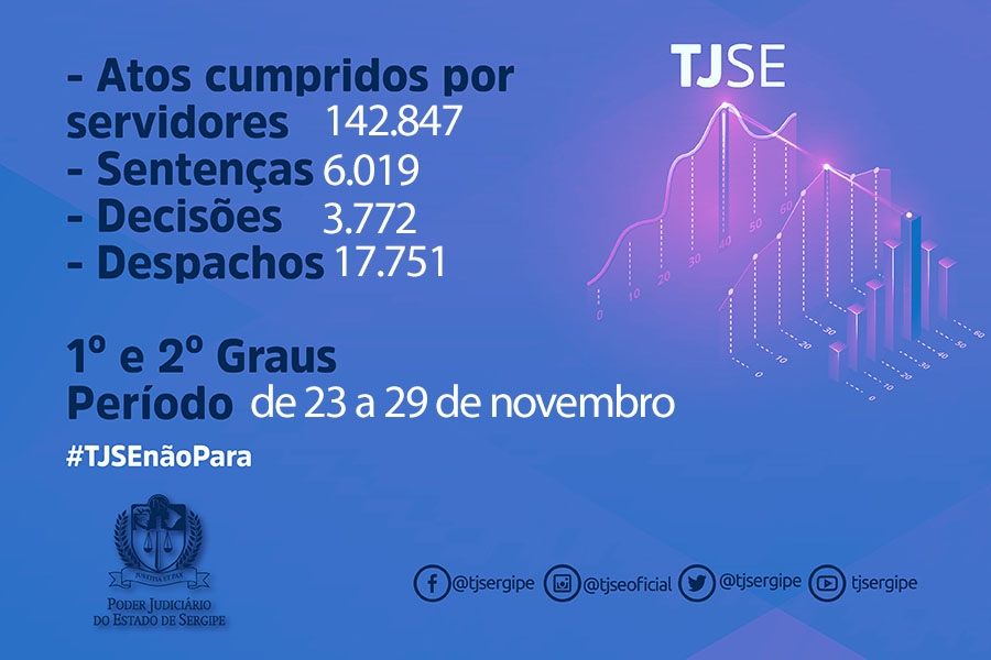 Foi divulgado pela Diretoria de Planejamento e Desenvolvimento do Tribunal de Justiça de Sergipe (TJSE), nesta segunda-feira, 30/11, os dados relativos à produtividade de magistrados e servidores. De 23 a 29 de novembro, os magistrados do TJSE produziram 6.019 sentenças, 3.772 decisões e 17.751 despachos; já os servidores cumpriram 142.847 atos. Em novembro, foram contabilizadas mais de 22 mil decisões.