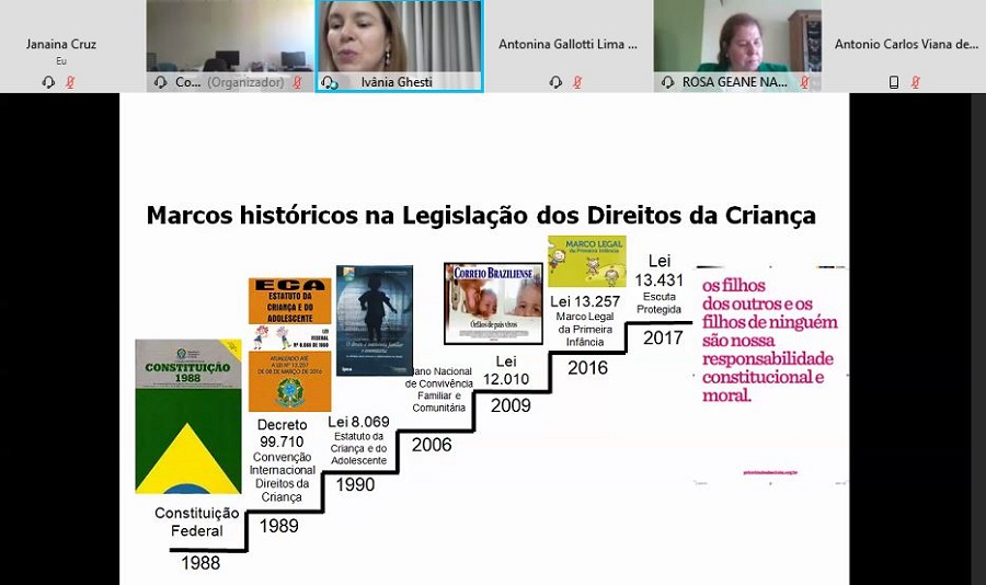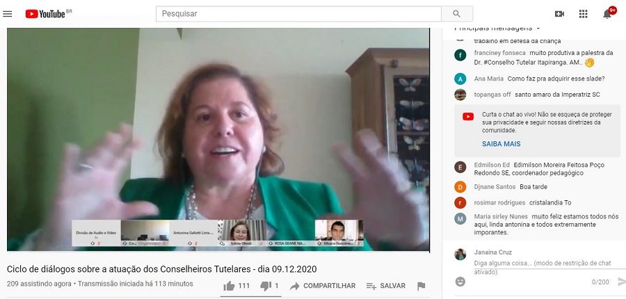 Ao final da tarde, houve um momento de diálogo, com o espaço para discussão e respostas às dúvidas dos participantes. Como o evento foi realizado por videoconferência, participaram Conselheiros Tutelares de inúmeros municípios sergipanos e também de outros Estados, a exemplo da Bahia e Santa Catarina. A programação do Ciclo de Diálogos está aberta a bacharéis em Direito, Pedagogos, Assistentes Sociais, Psicólogos e demais pessoas e profissionais afins ou atuantes nos eixos da proteção, promoção e defesa dos direitos das crianças e dos adolescentes. Será fornecido certificado aos participantes que acompanharem os três dias da programação.