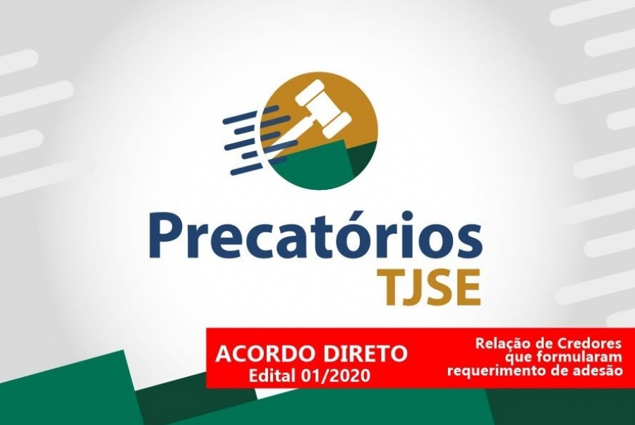 O Tribunal de Justiça do Estado de Sergipe, por meio do Departamento de Precatórios, torna pública a relação de credores de precatórios devidos pelo Município de Aracaju e Estado de Sergipe, administração direta e indireta, que formularam requerimento de adesão ao acordo direto regulado pelos Editais de Chamamento.