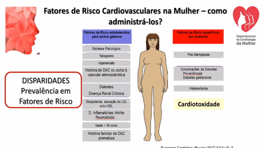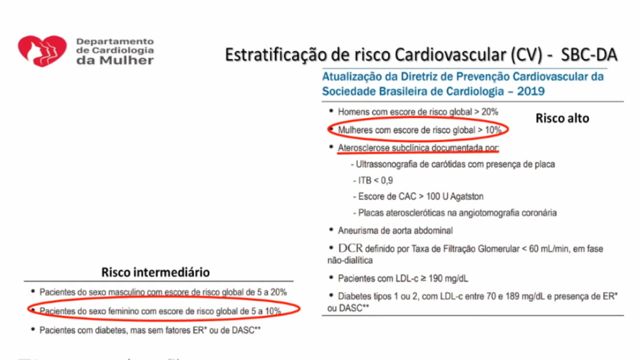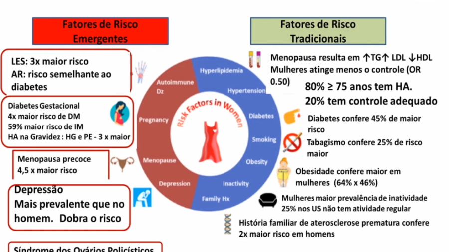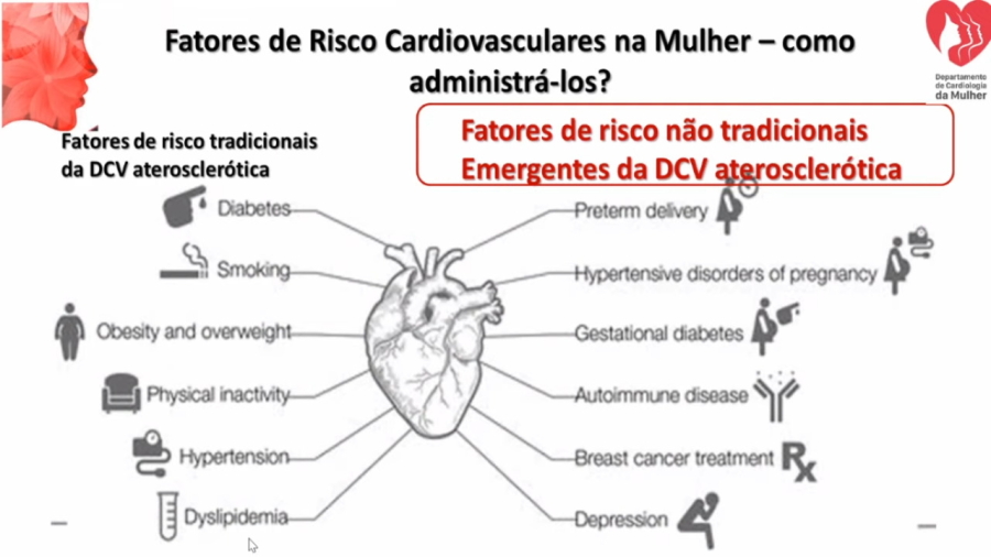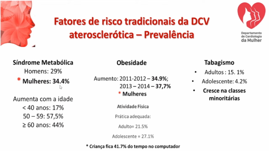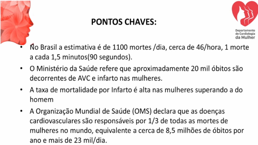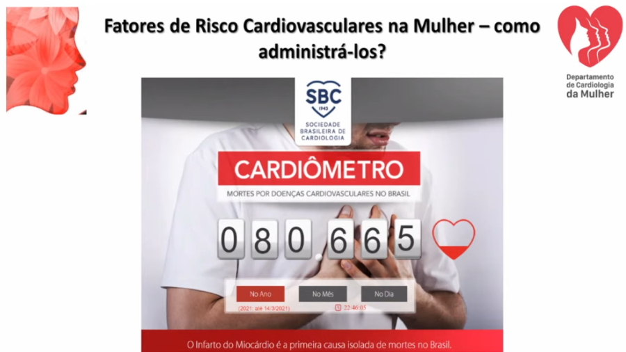 A palestrante, ainda, trouxe dados de estudos sobre a saúde da mulher, segundo o qual, 34,4% das mulheres são portadoras de síndrome metabólica, sendo que entre os 50 a 59 anos esse índice sobe para 57,7%. Que estudos brasileiros apontam que uma a cada cinco mulheres tem risco de ter infarto e que, no Brasil, das 80.665 mortes por doenças cardiovasculares, conforme dados divulgados em março de 2021, pela Sociedade Brasileira de Cardiologia, 30% referem-se à mulheres.