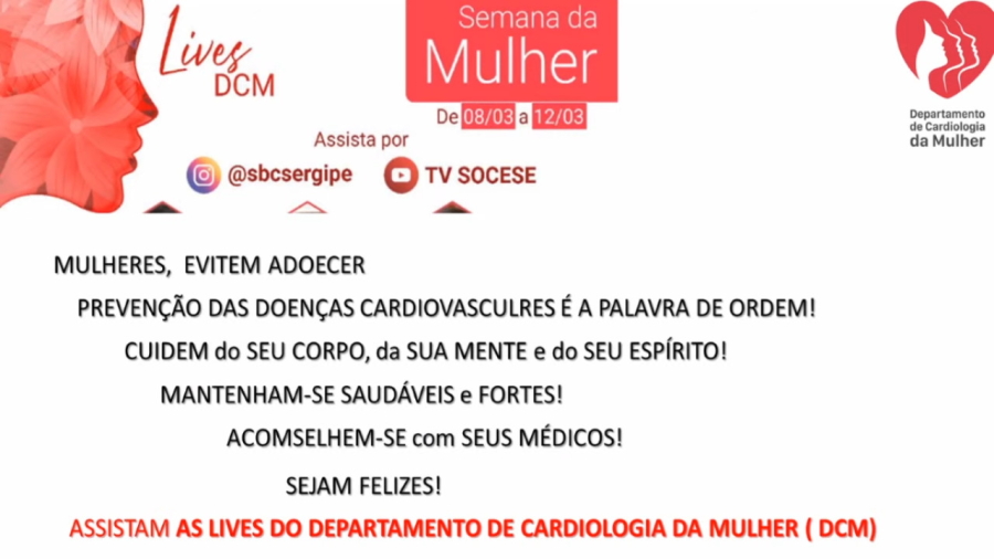 O Tribunal de Justiça de Sergipe, dando seguimento ao Ciclo de Palestra Virtuais em comemoração ao Dia Internacional da Mulher, promoveu nesta segunda-feira, dia 15/03, a segunda palestra do mês de março, com o tema "Doenças cardiovasculares em mulheres”. A palestrante foi a cardiologista Celi Marques Santos, que é Presidente do Departamento Nacional de Cardiologia da Mulher, da Associação Médica Brasileira e Mestre em Ciências da Saúde.