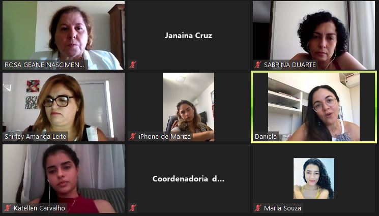 O atendimento à mulher vítima de violência doméstica e familiar contra a mulher foi tema de uma reunião realizada na manhã do último dia 23, por videoconferência, entre a equipe da Coordenadoria da Mulher do Tribunal de Justiça de Sergipe (TJSE) e a professora Daniela Costa, do Departamento de Direito da Universidade Federal de Sergipe (UFS). Na ocasião, também foi falado sobre os grupos reflexivos para homens agressores, o uso da Justiça Restaurativa nos casos de violência doméstica e implantação da Casa da Mulher Brasileira.