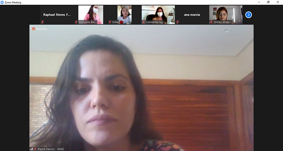 Da SEIAS, também participaram da reunião Érika Leite, Valdilene Martins, Adriana Lohana Santos, Elayne Passos, Sibelle Sá e Ana Márcia. Já da Secretaria de Estado de Governo, estiveram presentes Carlos Américo, Roberto Viana e Manoella Barreto. Da Coordenadoria da Mulher, participaram da reunião a psicóloga Sabrina Duarte, a assistente social Shirley Leite e a assessora Mariza Santos.