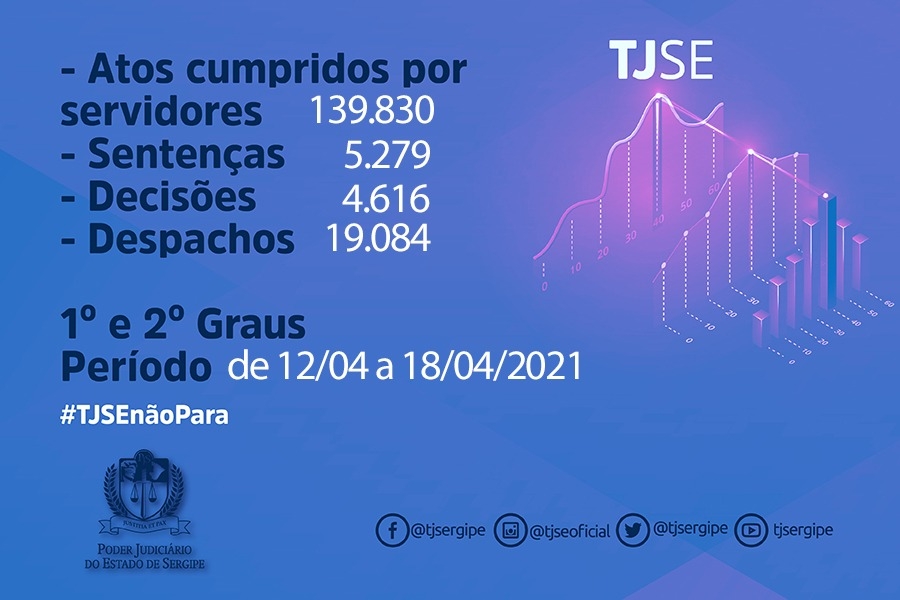 De 12 a 18 de abril, os magistrados do Tribunal de Justiça de Sergipe (TJSE) produziram 5.279 sentenças, 4.616 decisões e 19.084 despachos. Os servidores, nesse período, cumpriram 139.830 atos. Os dados relativos à produtividade de magistrados e servidores são divulgados, semanalmente, pela Diretoria de Planejamento e Desenvolvimento do TJSE.