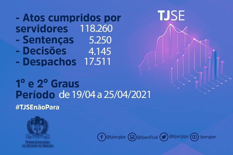 De 19 a 25 de abril, os magistrados do Tribunal de Justiça de Sergipe (TJSE) produziram 5.250 sentenças, 4.145 decisões e 17.511 despachos. Os servidores, nesse período, cumpriram 118.260 atos. Os dados relativos à produtividade de magistrados e servidores são divulgados, semanalmente, pela Diretoria de Planejamento e Desenvolvimento do TJSE.