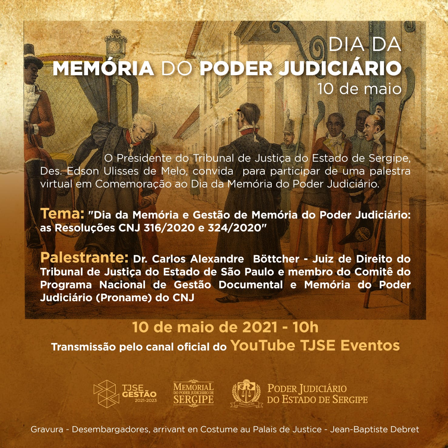 Em comemoração ao Dia da Memória do Poder Judiciário, o Poder Judiciário de Sergipe, através do Memorial do Judiciário, realizará uma palestra sobre "Dia da Memória e Gestão de Memória do Poder Judiciário: as Resoluções CNJ 316/2020 e 324/2020". O evento será transmitido pelo canal TJSE Eventos, no YouTube, no dia 10 de maio, às 10 horas.