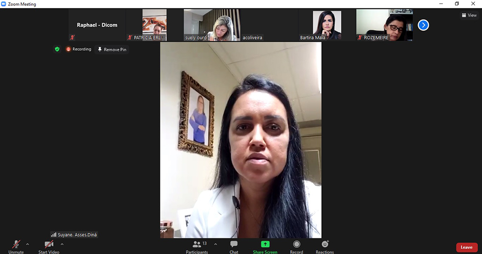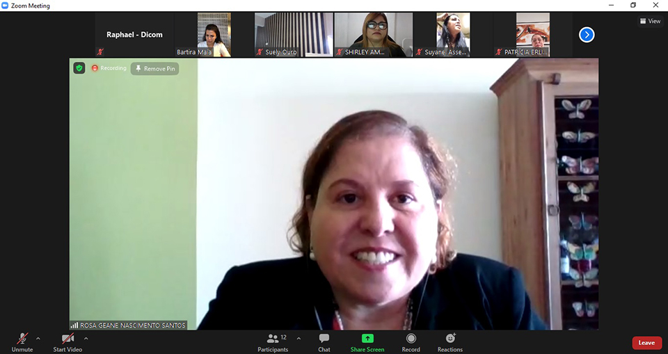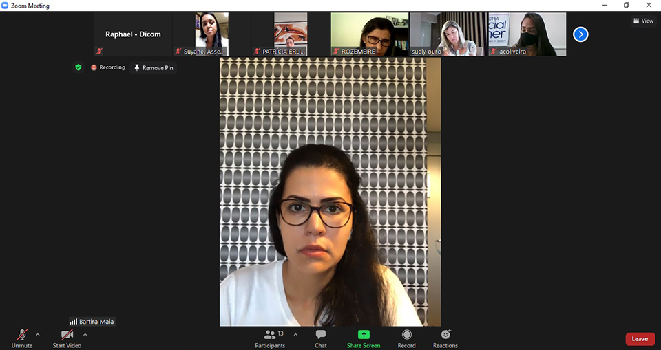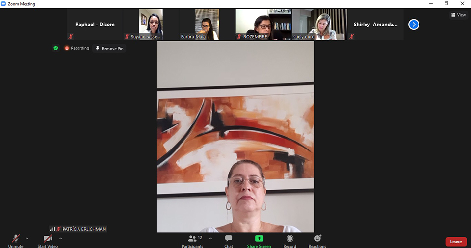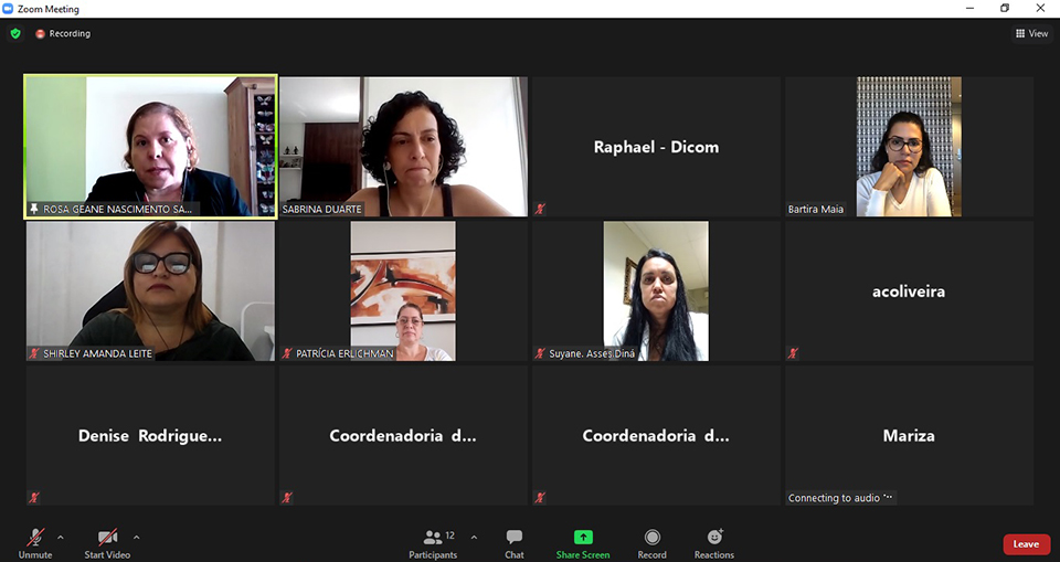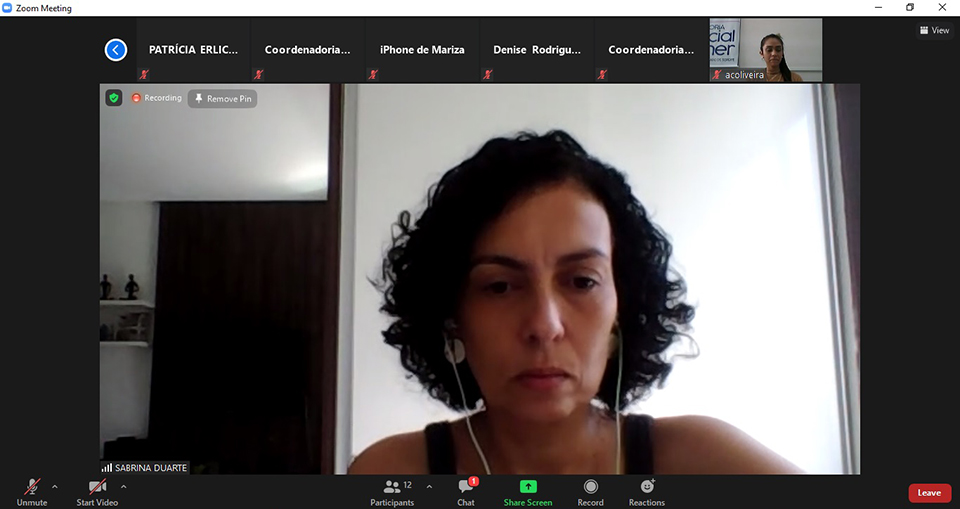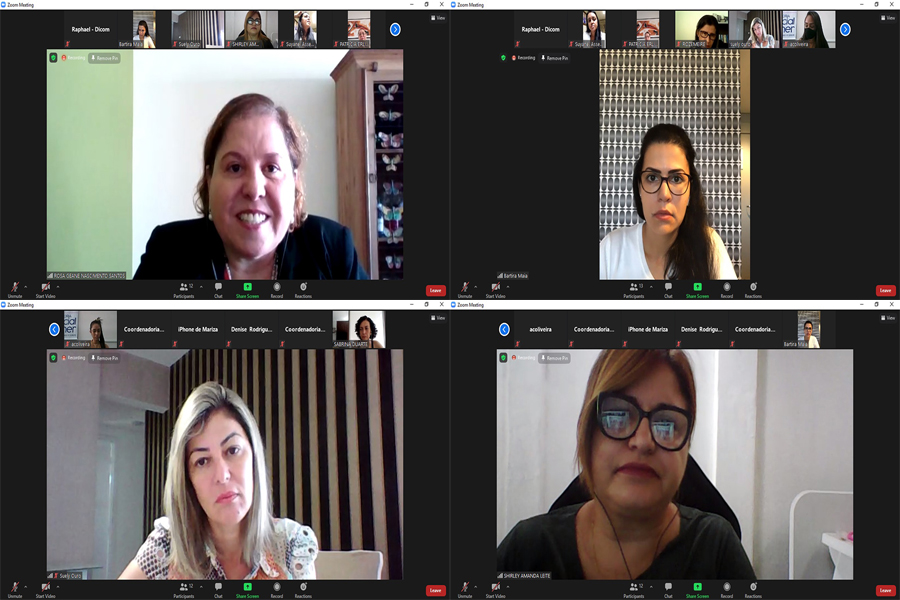 Da Coordenadoria da Mulher, participaram a Juíza Coordenadora Rosa Geane Nascimento; a Psicóloga Sabrina Duarte; a Assistente Social Shirley Leite; a Assessora Mariza Santos e a técnica Vânia Barbosa. E da Procuradoria da Mulher da ALESE, a Coordenadora Rozimeire Santos, as Advogadas Bartira Maia e Patrícia Erlichman; as Assistentes Suely Ouro e Amanda Oliveira e a Assessora da Deputada Diná Almeida, Suyane. As participantes conversaram sobre os temas que serão abordados no webinário e os prováveis palestrantes.