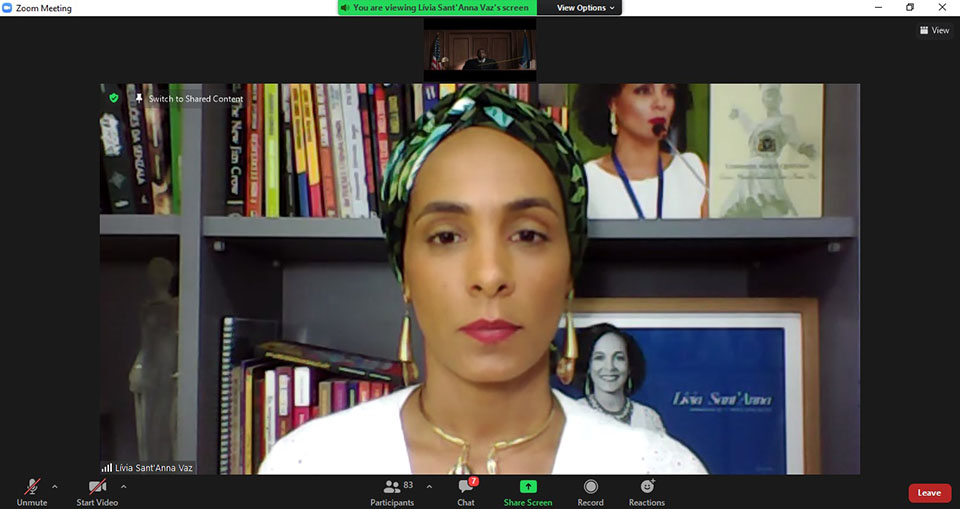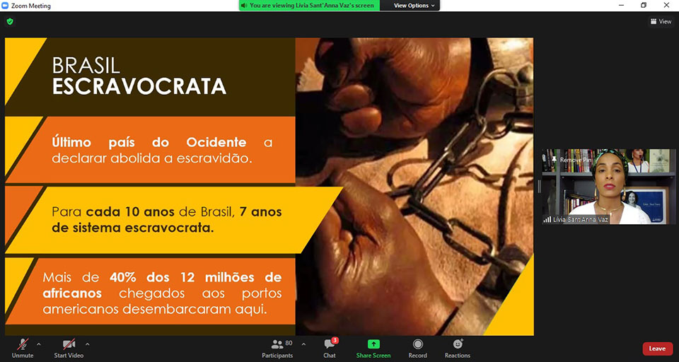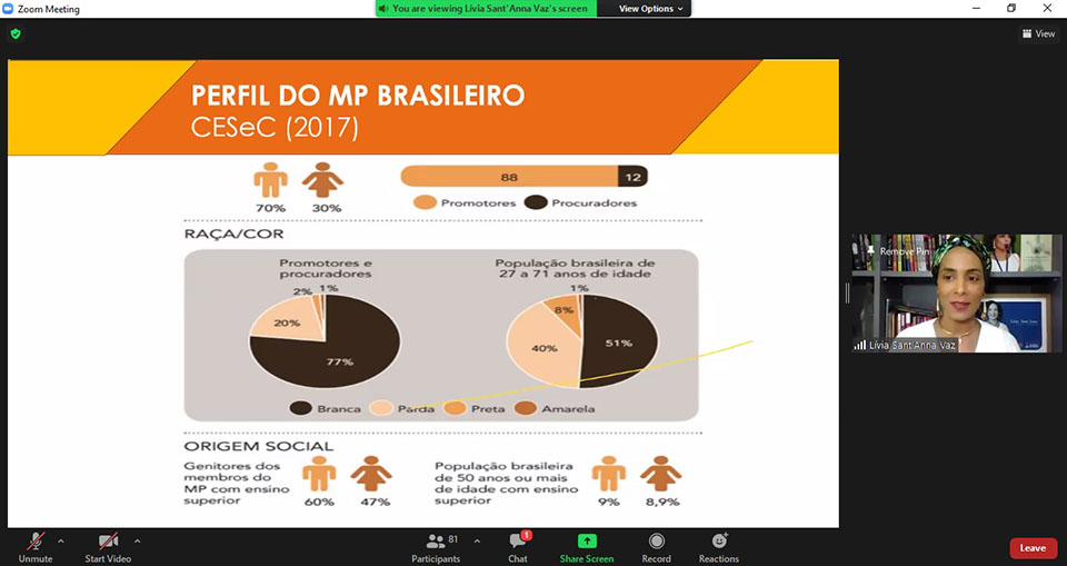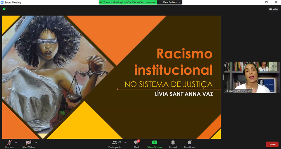 A palestra inaugural do seminário foi ministrada pela Promotora de Justiça Lívia Sant’Anna Vaz, do Ministério Público da Bahia, e doutoranda em Direito pela Universidade de Paris I – Sorbonne. Ela compartilhou dados da escravidão no Brasil, que foi o país que mais recebeu pessoas africanas escravizadas no mundo, mas foi o último do Ocidente a declarar abolida a escravidão. Ela falou também sobre o ordenamento jurídico no país quanto ao racismo e apresentou dados do Atlas da Violência de 2020. Conforme o estudo, 75,7% das vítimas de homicídio no país eram negras e, entre 2004 e 2018, os homicídios de mulheres negras aumentaram 12,4%.
