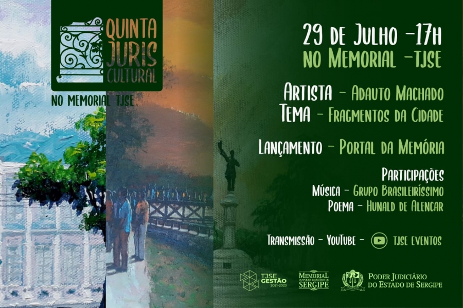 Nesta primeira edição do Projeto “Quinta Juriscultural” será realizada a exposição do artista plástico Adauto Machado, sobre o tema “Fragmentos da Cidade”, que traz obras do artista com o impressionismo das marinhas com o pôr do sol, arquitetura urbana e recortes sociorreligiosos da festa de Bom Jesus dos Navegantes, na chamada Ponte do Imperador, em Aracaju. Além disso, a apresentação do Grupo musical “Brasileiríssimo” e recital poético da obra do poeta Hunald de Alencar, com a interpretação do poeta Ronaldson Sousa.