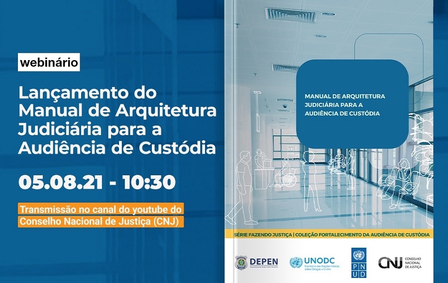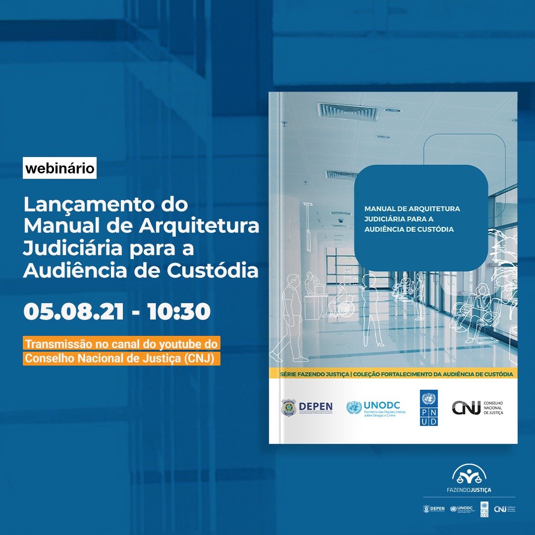 Será realizado nesta quinta-feira, 05/08, às 10h30, no canal do Conselho Nacional de Justiça (CNJ), no YouTube, um webinário para o lançamento do Manual de Arquitetura Judiciária para a Audiência de Custódia. O manual integra a coleção ‘Fortalecimento das Audiências de Custódia’, do Programa Fazendo Justiça, do CNJ. No manual, serão apresentados parâmetros, diretrizes e programa mínimo de necessidades para o projeto arquitetônico humanizado dos espaços da audiência de custódia.