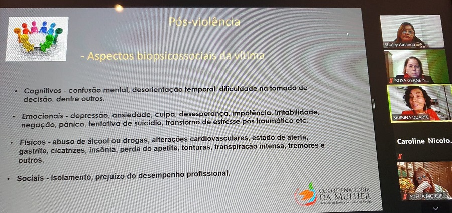 Foi apresentada a linha do tempo da legislação protetiva à mulher vítima de violência, as atualizações, a exemplo da Lei do Sinal Vermelho; os aspectos biopsicossociais da vítima; as questões sociais e psicológicas inseridas no ciclo da violência; bem como as estratégias e intervenções psicossociais; além das articulações e os projetos desenvolvidos pela Coordenaria da Mulher no enfrentamento à violência doméstica e familiar e ao feminicídio.