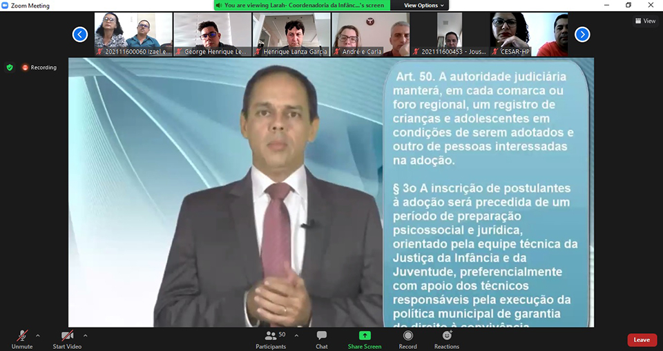 A Coordenadoria da Infância e Juventude (CIJ) do Tribunal de Justiça de Sergipe (TJSE) realizou na manhã desta segunda-feira, 23/08, a quarta edição de 2021 do Curso de Preparação Psicossocial e Jurídica para Pretendentes à Adoção, por meio de videoconferência. O objetivo é prestar informações sobre direitos, deveres, legislação e sobre o que é necessário para a construção de uma relação afetiva entre o adotado e a nova família.