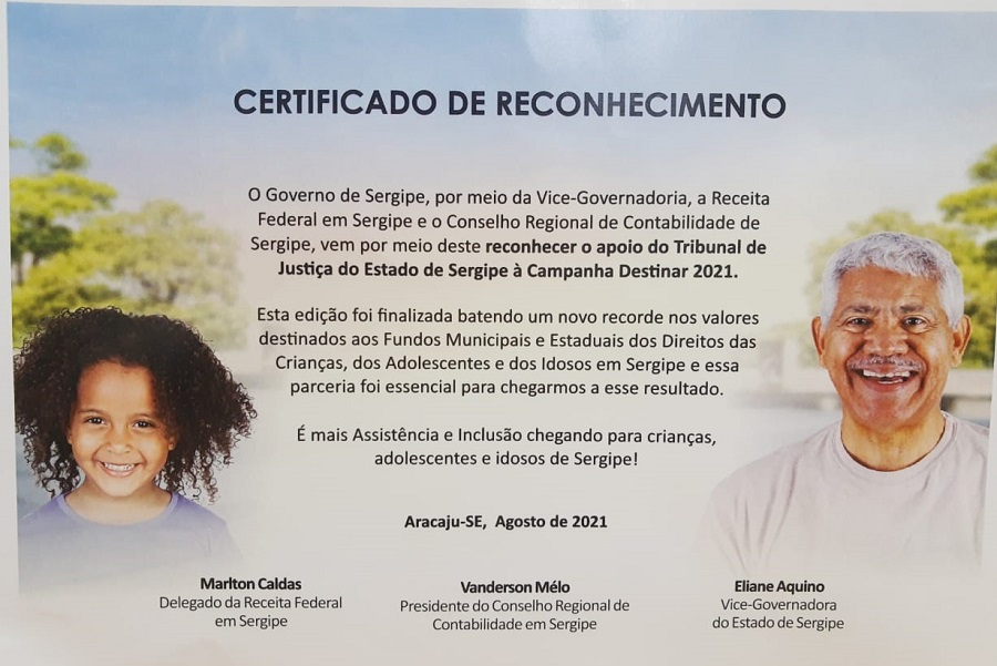 O Certificado de Reconhecimento pelo apoio do TJSE à Campanha Destinar 2021, enviado ao Desembargador-Presidente Edson Ulisses de Melo, pelos idealizadores da Campanha, destaca que "esta edição foi finalizada batendo um novo recorde nos valores destinados aos Fundos Municipais e Estaduais dos Direitos das Crianças, dos Adolescentes e dos Idosos em Sergipe e essa parceria foi essencial para chegarmos a esse resultado".