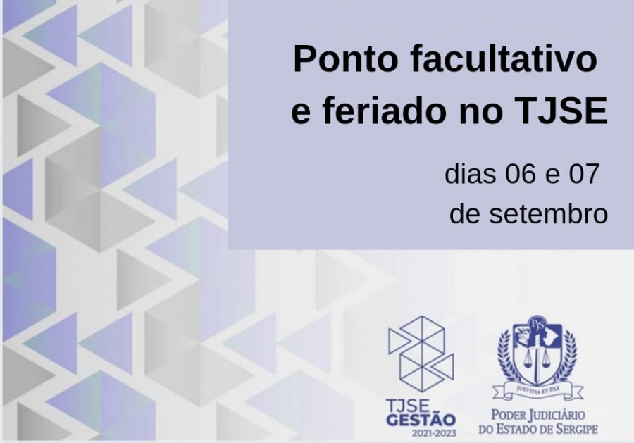 Foi publicada no Diário da Justiça desta quinta-feira, 02/09, a Portaria Normativa 67/2021, que declarou ponto facultativo no Poder Judiciário do Estado de Sergipe o expediente do dia 06 de setembro, segunda-feira. Os prazos processuais serão prorrogados até o primeiro dia útil seguinte, consoante o disposto no artigo 219 do Código de Processo Civil.