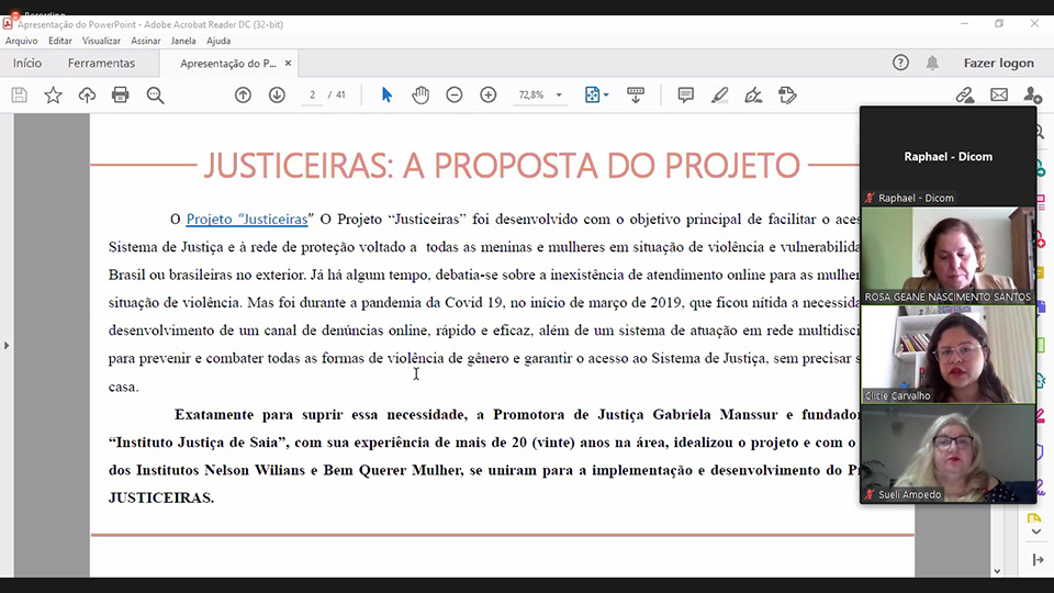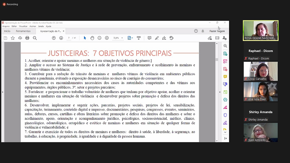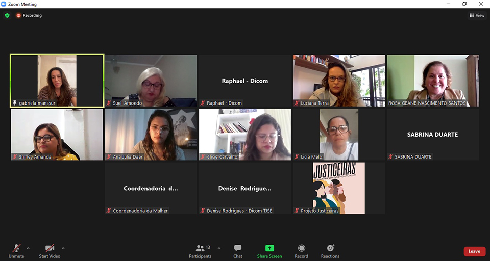 A Coordenadoria da Mulher do Tribunal de Justiça de Sergipe (TJSE) realizou uma reunião solicitada por as representantes do Projeto Justiceiras, o qual foi inaugurado em março de 2020, logo no início da pandemia da Convid-19, e visa ao enfrentamento à violência doméstica e familiar contra a mulher. O encontro, ocorrido em 27/08, foi para que a Coordenadoria da Mulher conhecesse o Projeto Justiceiras, uma vez que o objetivo das idealizadoras é estender sua atuação em Sergipe.