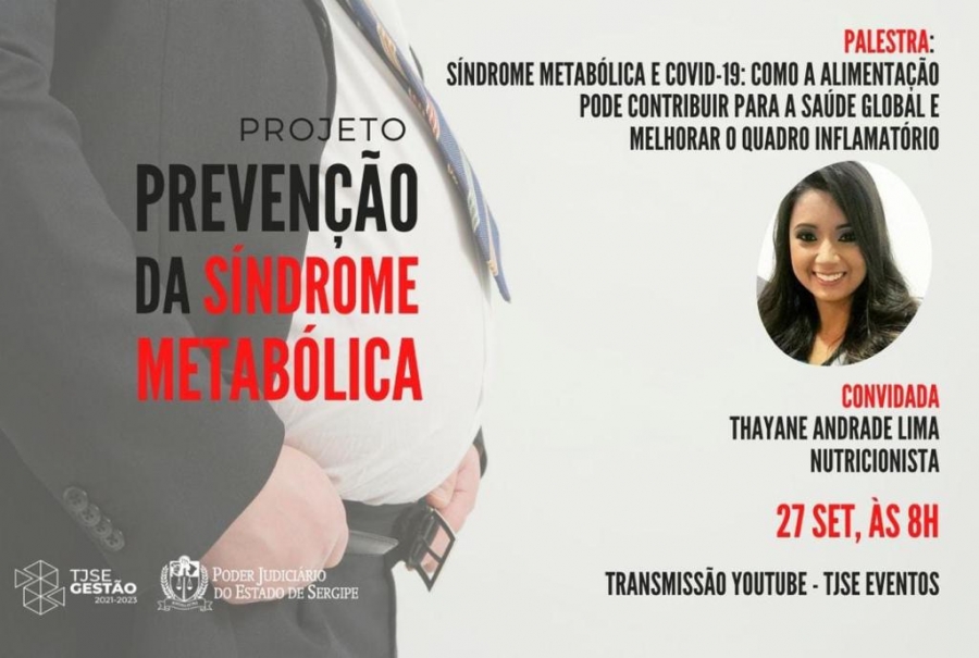"Síndrome Metabólica e Covid-19: como a alimentação pode contribuir para a saúde global e melhorar o quadro inflamatório" é o tema de uma palestra que será realizada na próxima segunda-feira, 27/09, às 8 horas, no canal TJSE Eventos, no YouTube. A palestra será ministrada pela nutricionista Thayane Andrade Lima.