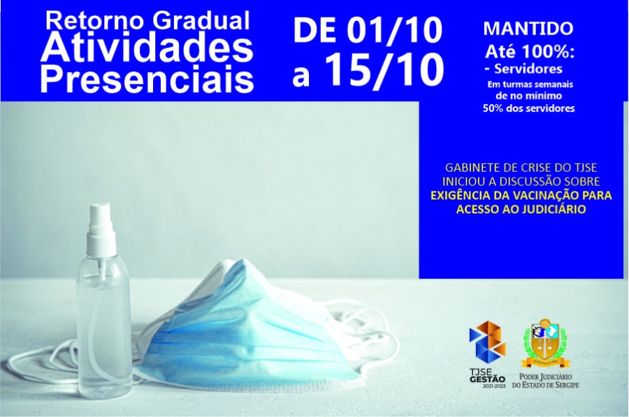 Em reunião realizada nesta sexta-feira, 24/09, o Gabinete de Crise do TJSE deliberou pela manutenção da Retomada das Atividades Presenciais no Judiciário sergipano até 15/10, conforme a Portaria Conjunta 65/2021 - GP1 Normativa e alterada pela Portaria Conjunta 70/2021, atendidos os eixos temáticos de Distanciamento Social, Sanitização de Ambientes, Higiene/Proteção Pessoal, Comunicação Efetiva e Monitoramento.