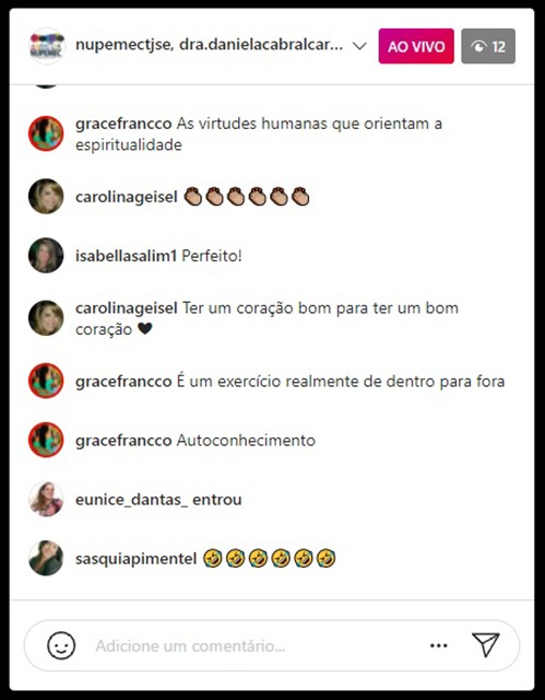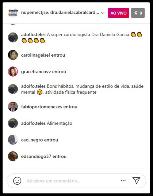 Durante a live, foram abordadas questões relevantes para a manutenção da saúde e da qualidade de vida. A cardiologista falou sobre a prática de atividade física, pontuando que o importante seria praticar, no mínimo, atividades por 150 minutos, semanalmente. Destacou que as atividades físicas devem ser mantidas de forma moderada e rotineira, com respeito ao corpo e às recomendações médicas.