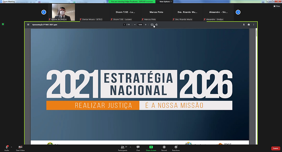 Foi realizada na manhã desta sexta-feira, 22/10, a 40ª Reunião de Análise da Estratégia (RAE) do Tribunal de Justiça de Sergipe (TJSE), terceira de 2021 e quinta por videoconferência, devido às medidas de distanciamento impostas pela pandemia da Covid-19. Foram apresentados os resultados parciais de metas e projetos estratégicos, que já chegaram, este ano, a um cumprimento de 94,23%. A reunião contou com participação do Presidente do Tribunal de Justiça do Piauí, Desembargador José Ribamar de Oliveira.