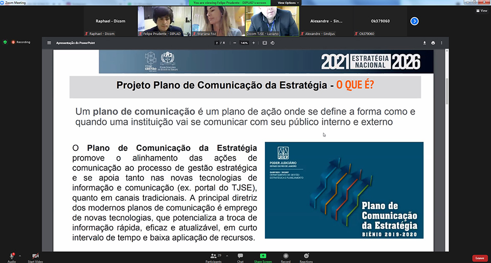 Um desses novos projetos é o Plano de Comunicação da Estratégia, que foi apresentado pelo Diretor de Comunicação do TJSE, Luciano Araujo. “Estamos colocando no papel, de forma sistematizada, tudo que diz respeito à comunicação e à estratégia. O Plano pretende aperfeiçoar a comunicação entre Poder Judiciário e sociedade, por meio de informações simples, acessíveis e explicativas acerca da instituição”, informou o Diretor.