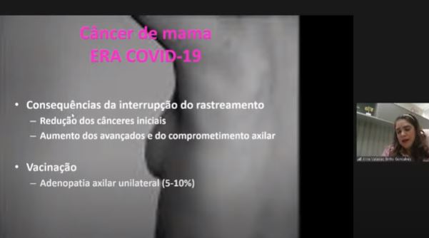 A mastologista informou ainda que de 40% a 60% dos casos são diagnosticados em estágios mais avançados. “A pandemia da Covid-19 nos mostrou que o rastreamento do câncer de mama não pode ser interrompido. O que vimos agora foi a redução dos cânceres iniciais e um aumento dos casos mais avançados e do comprometimento axilar”, alertou Aline, lembrando que a atividade física regular e alimentação equilibrada são capazes de reduzir em 30% a probabilidade de ter câncer de mama.